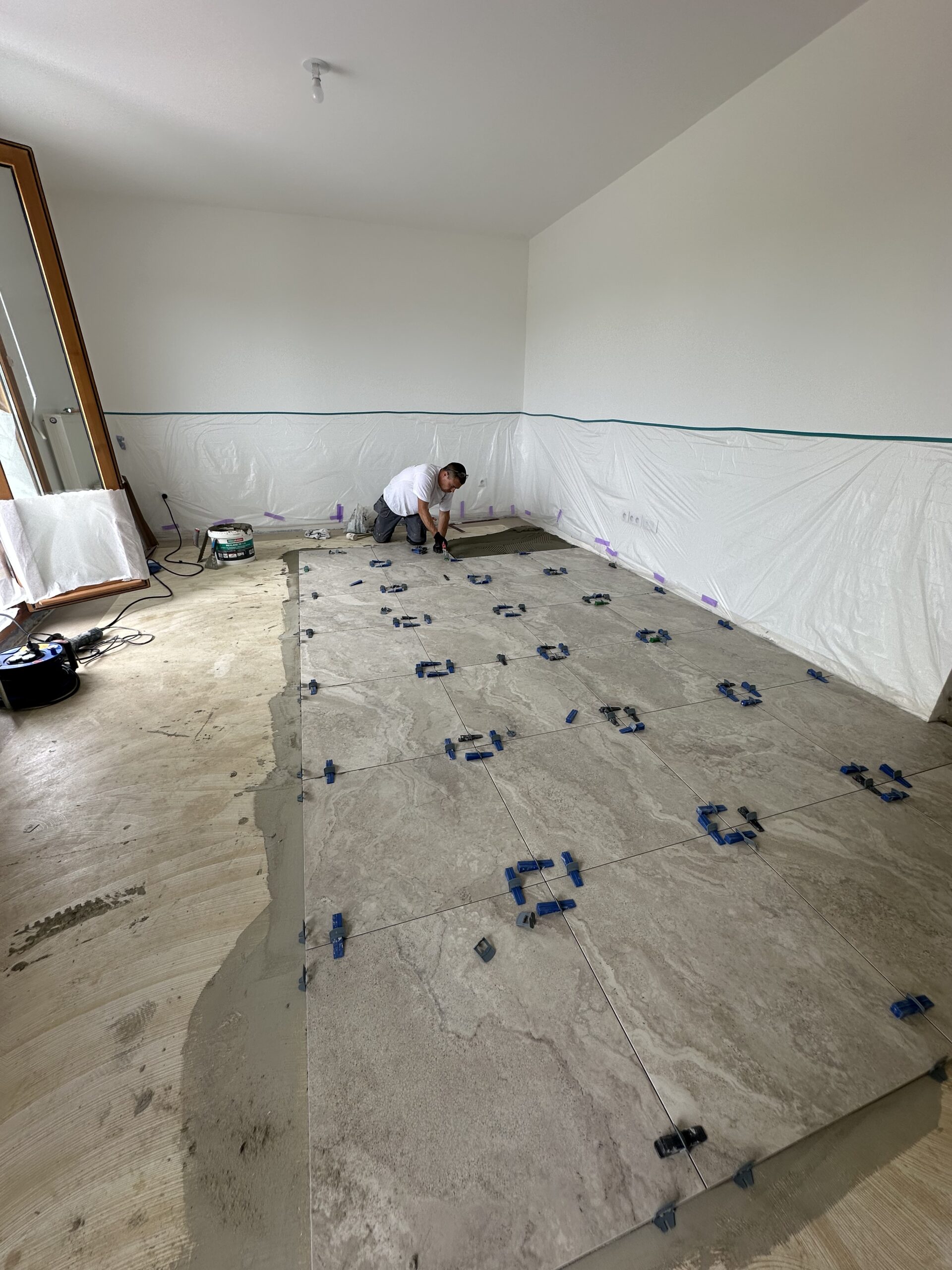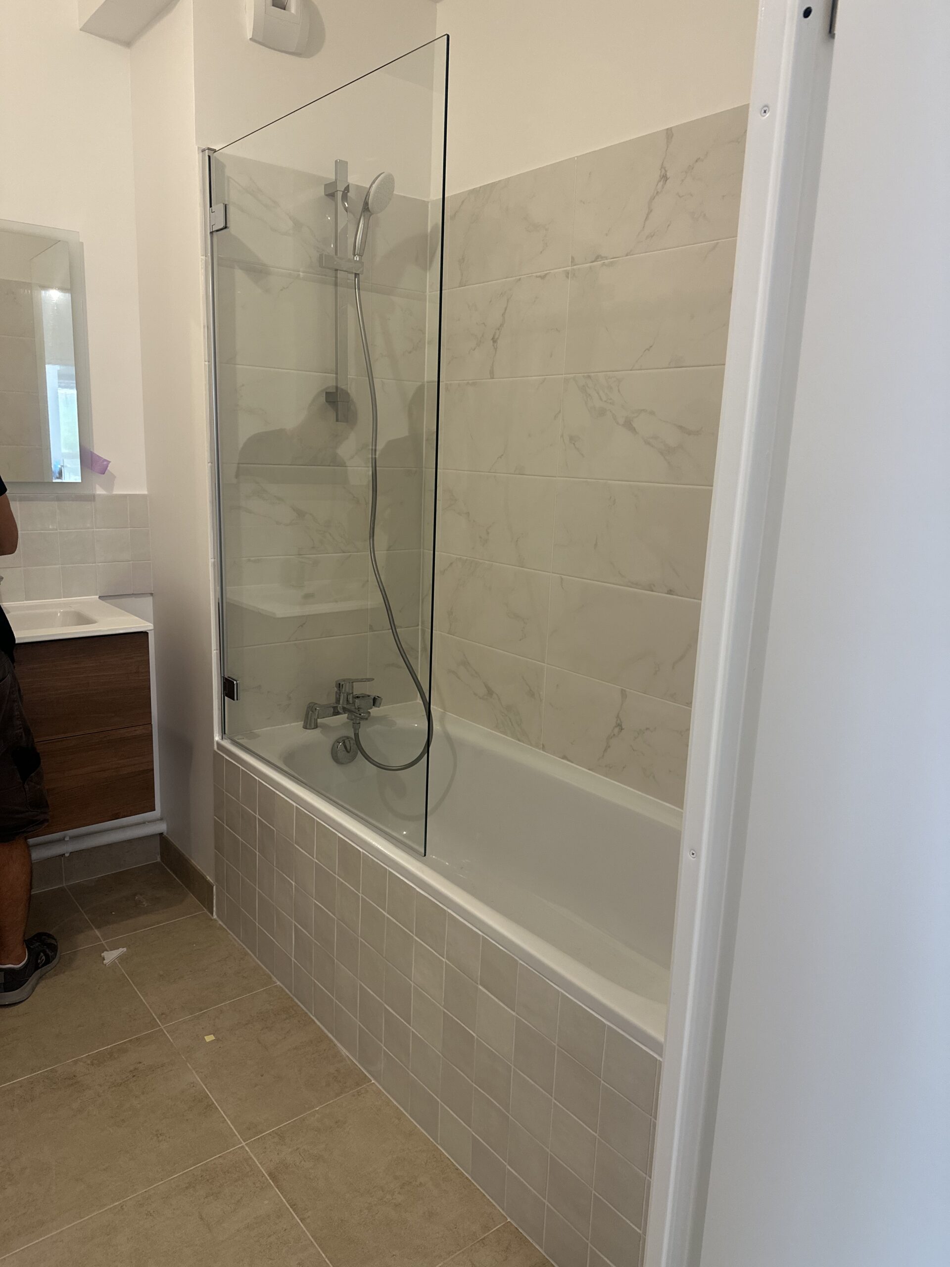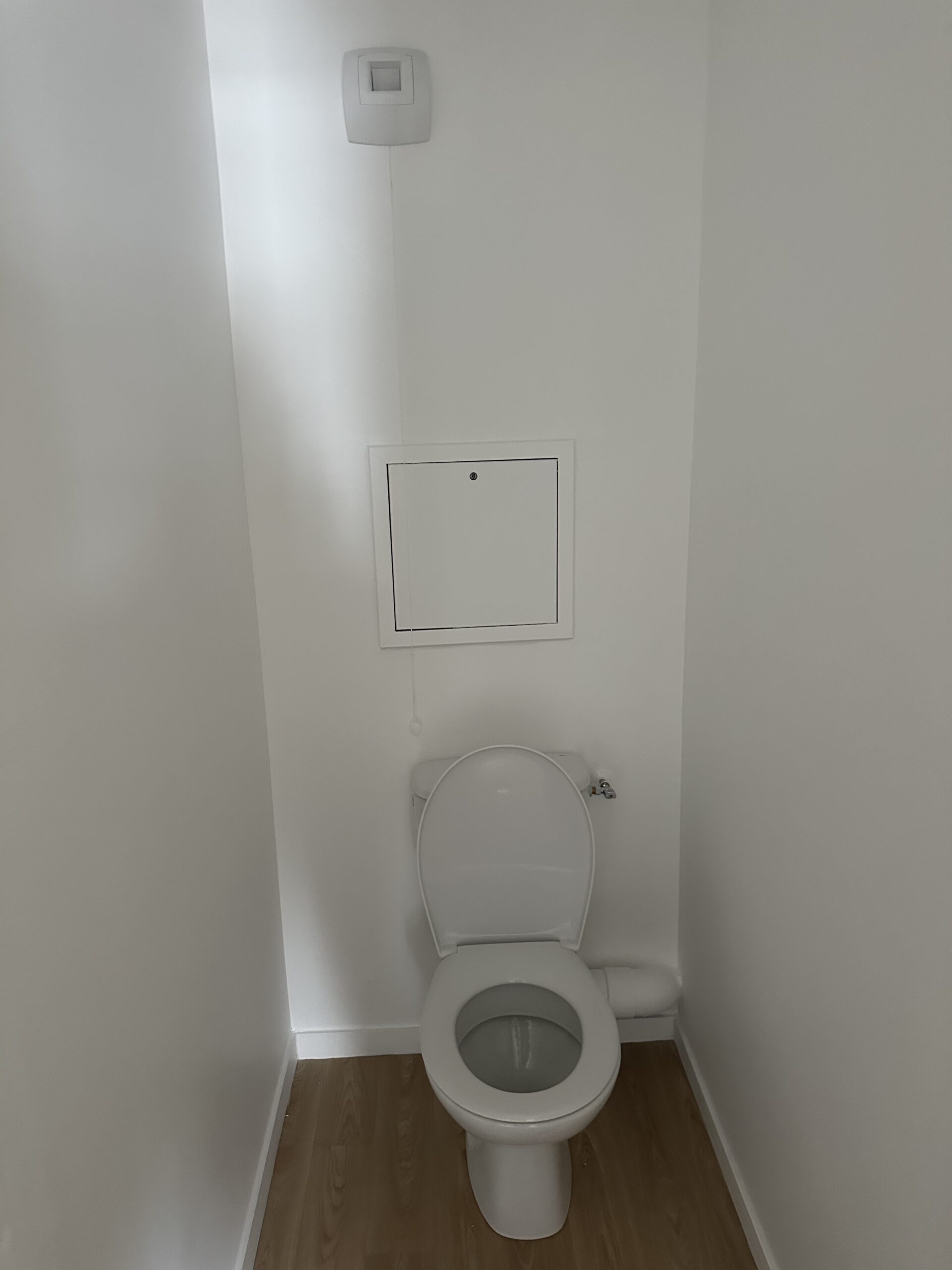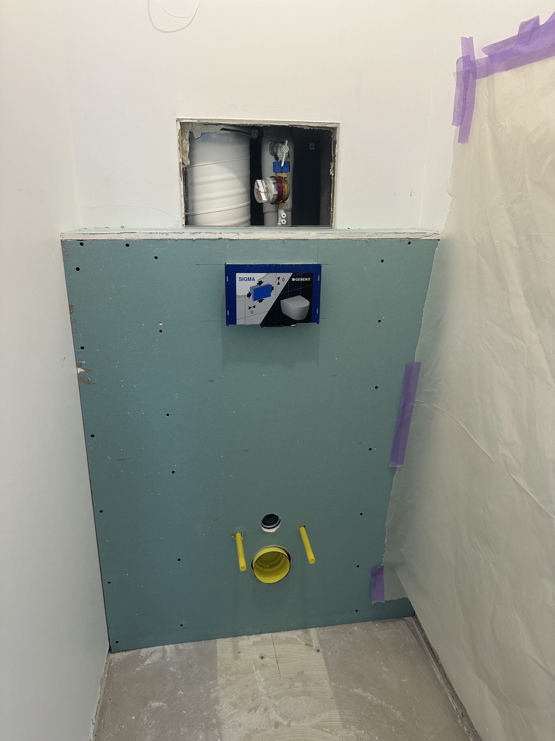 Dans la toilette, installation d’un WC suspendu avec carrelage mural et au sol.