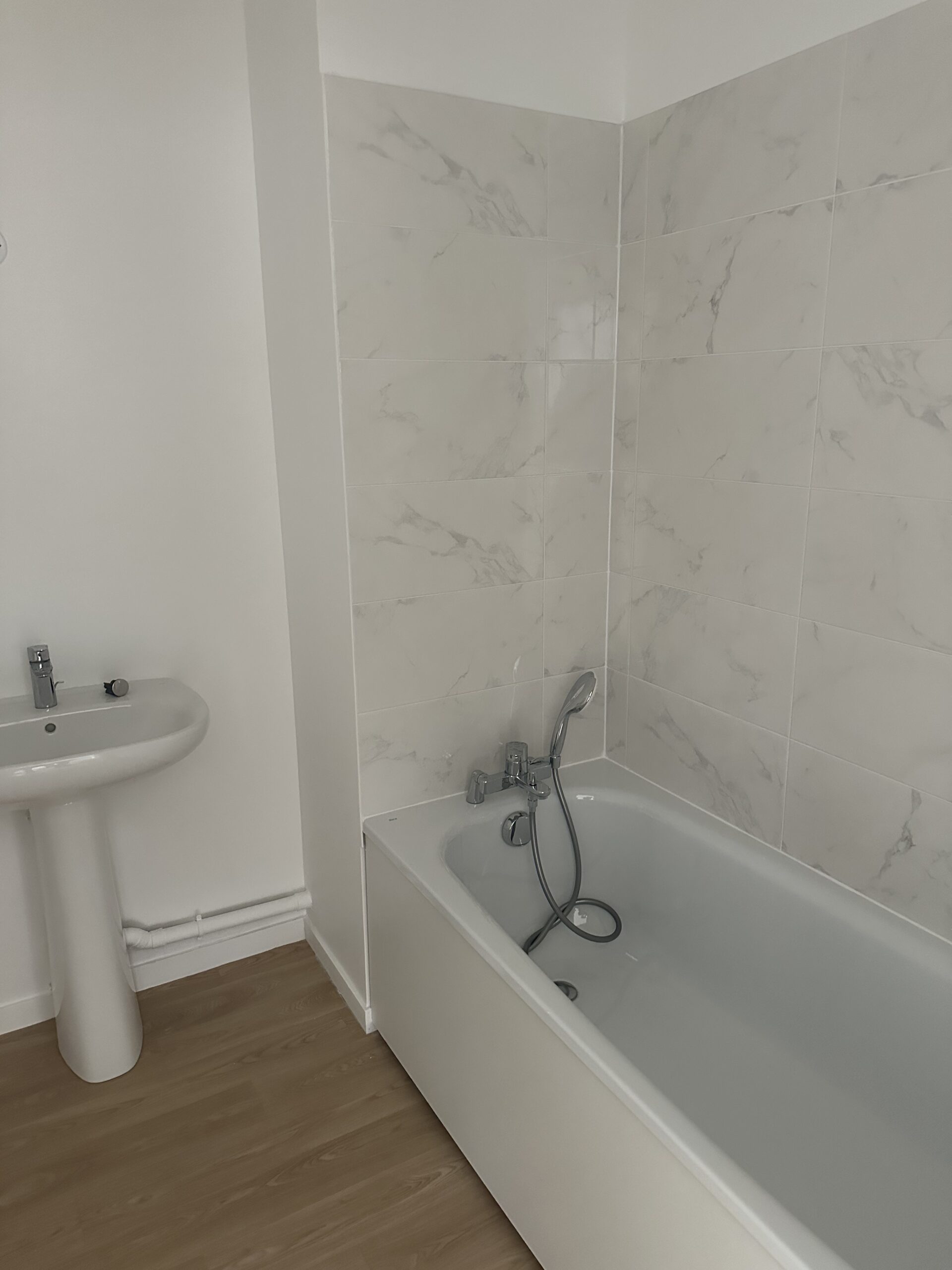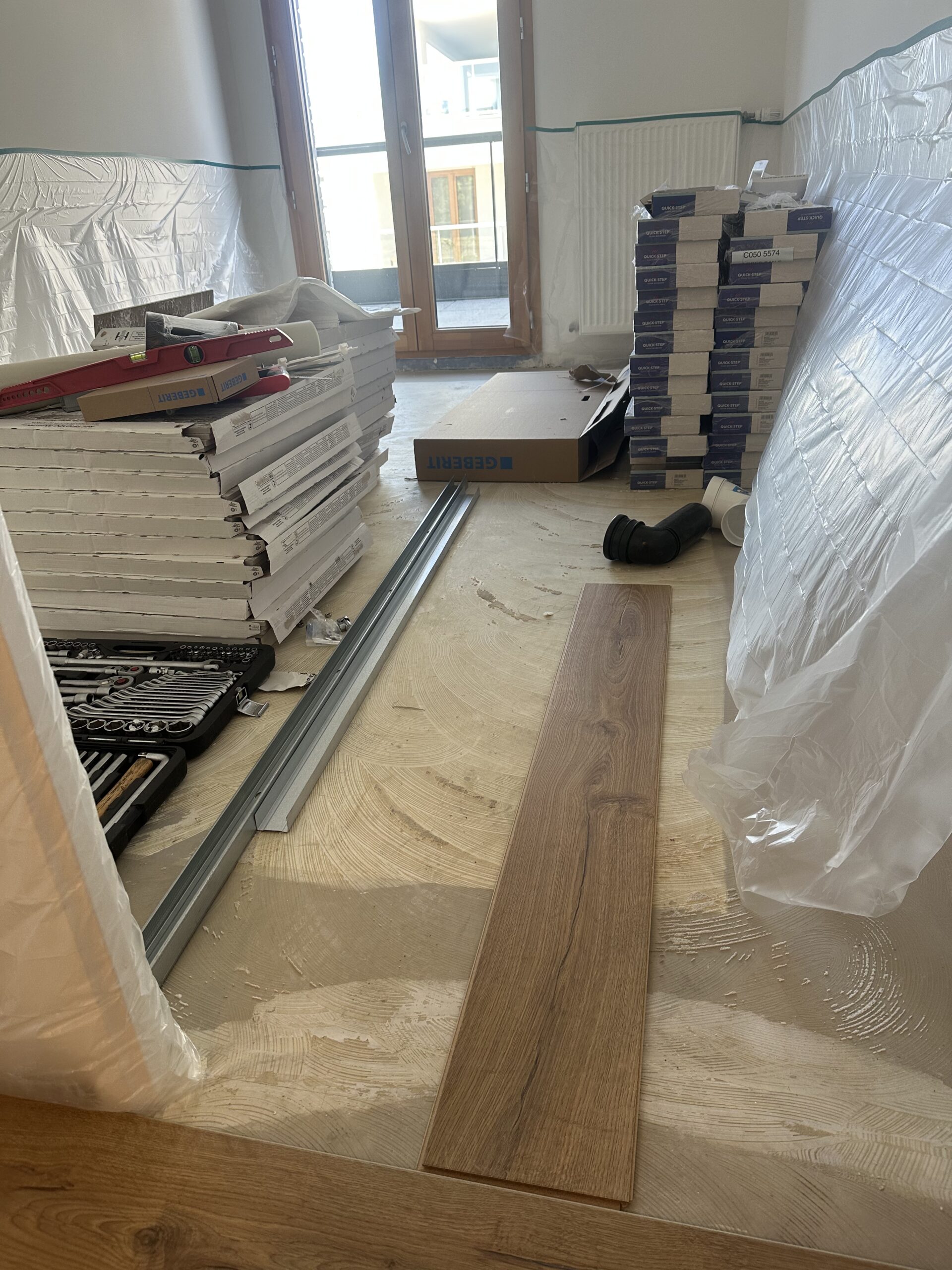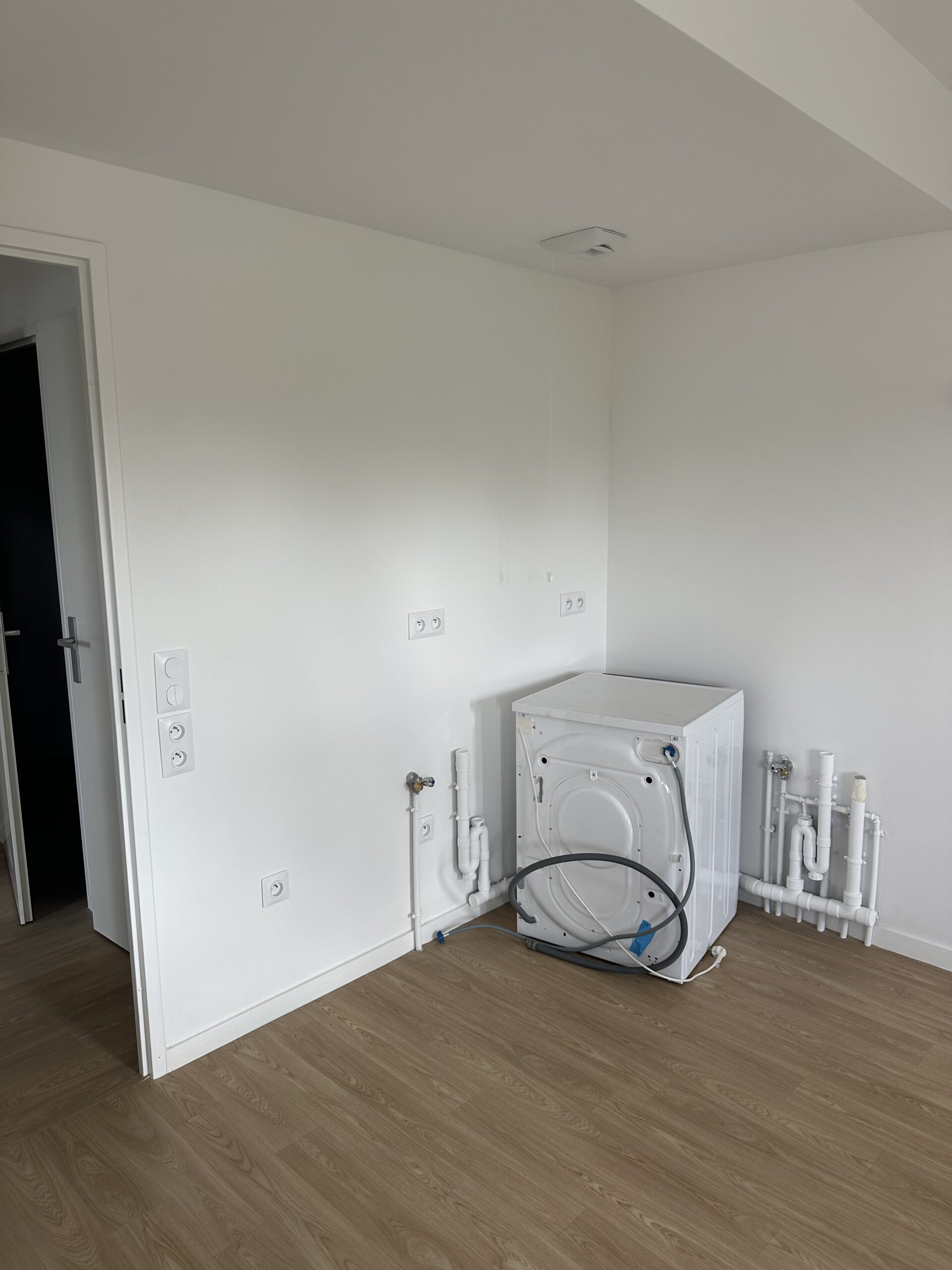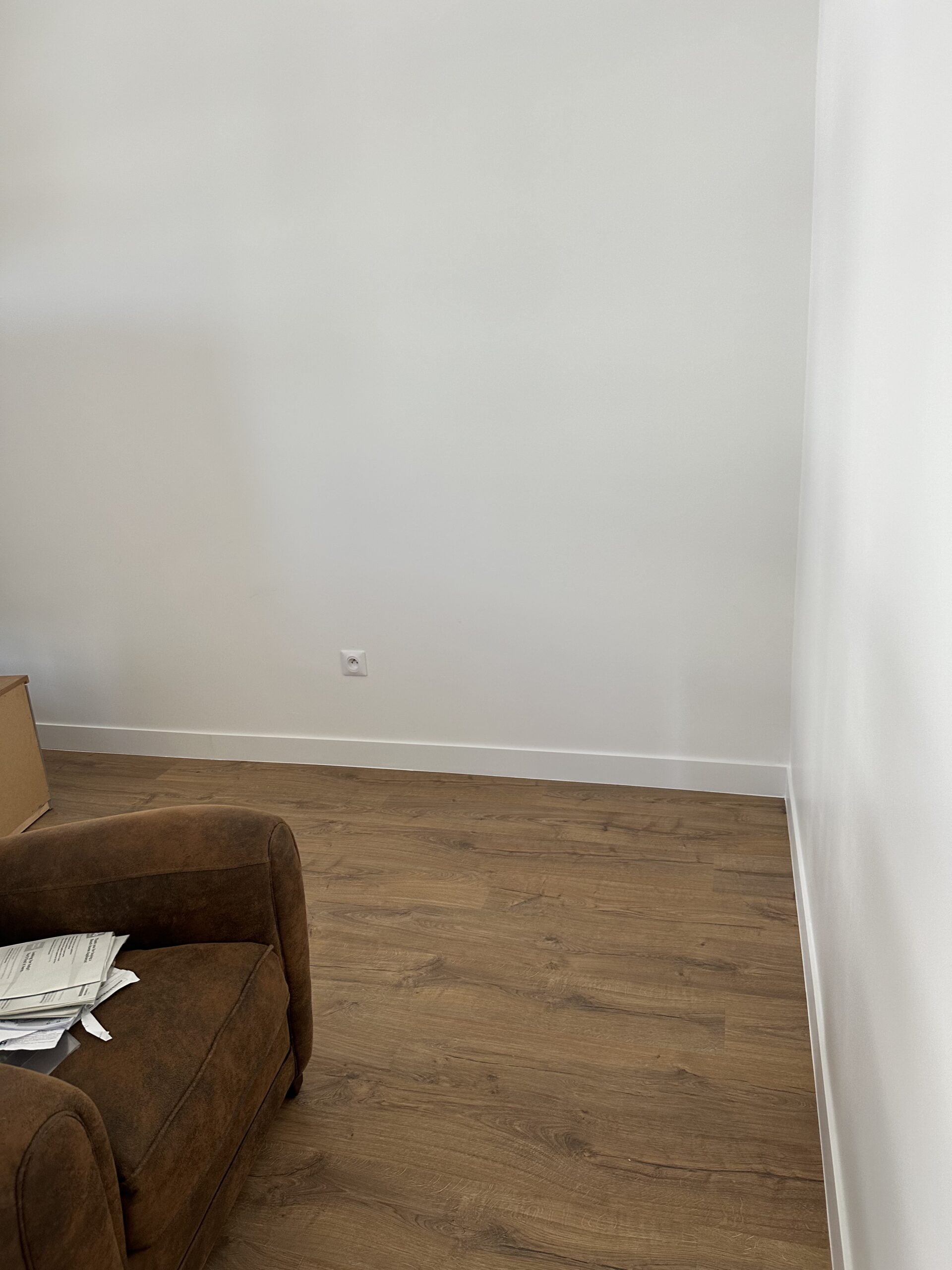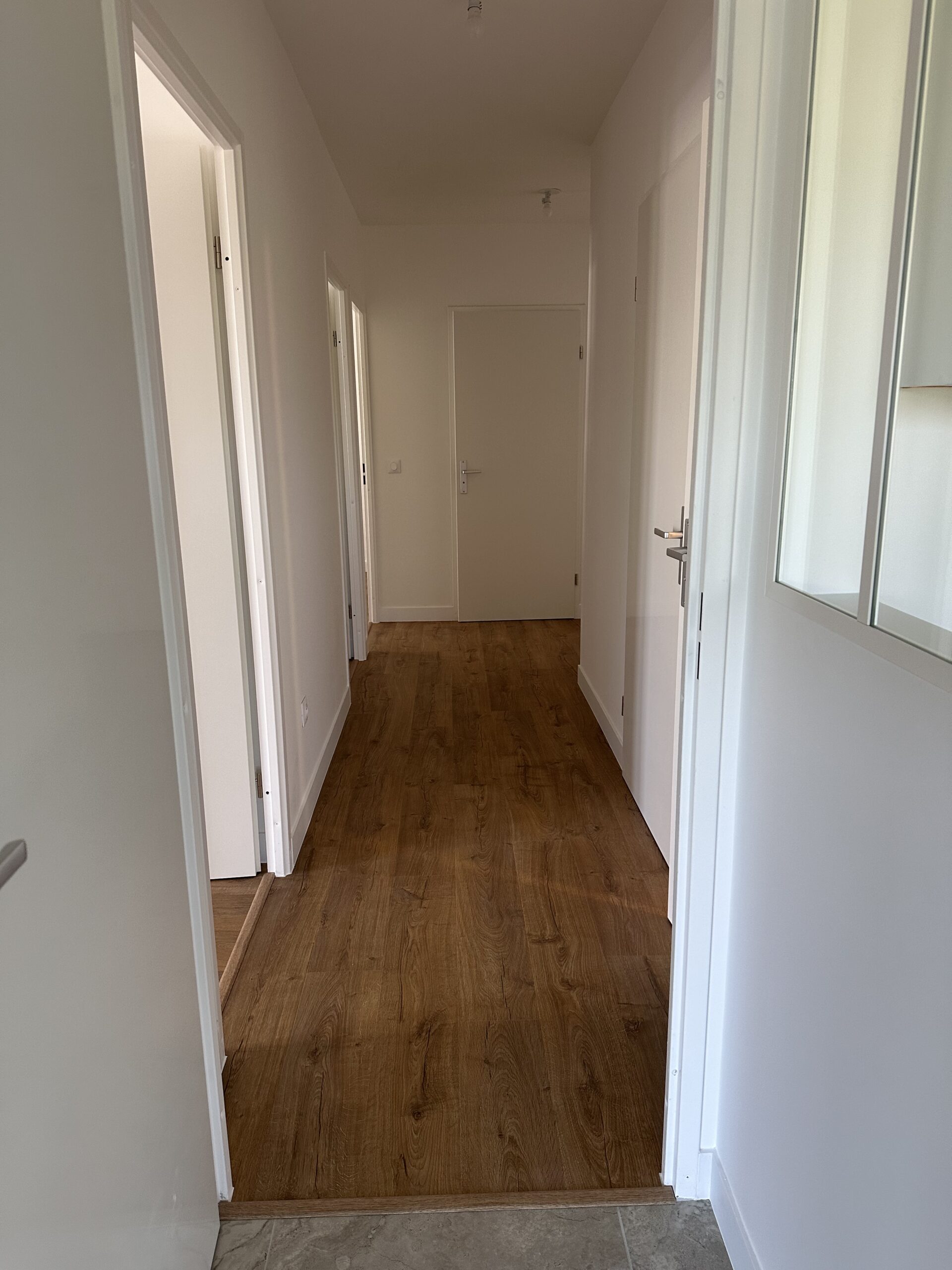 Pose d’un parquet dans les quatre chambres, le couloir et le séjour, offrant une finition chaleureuse et moderne.