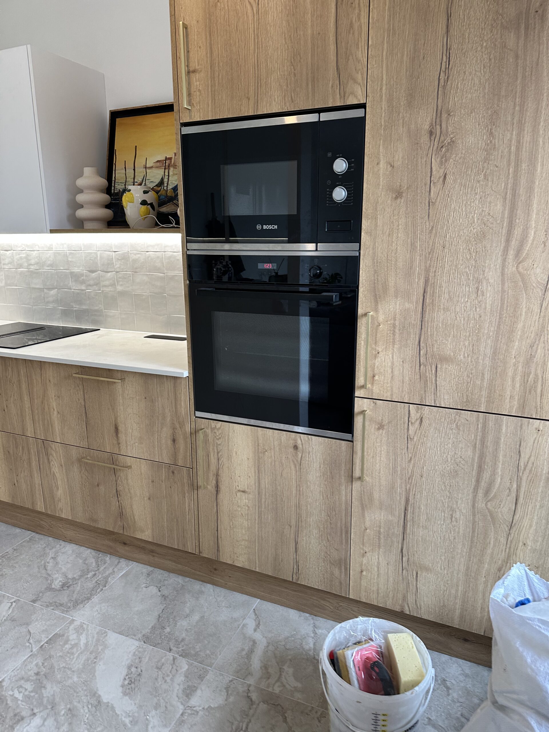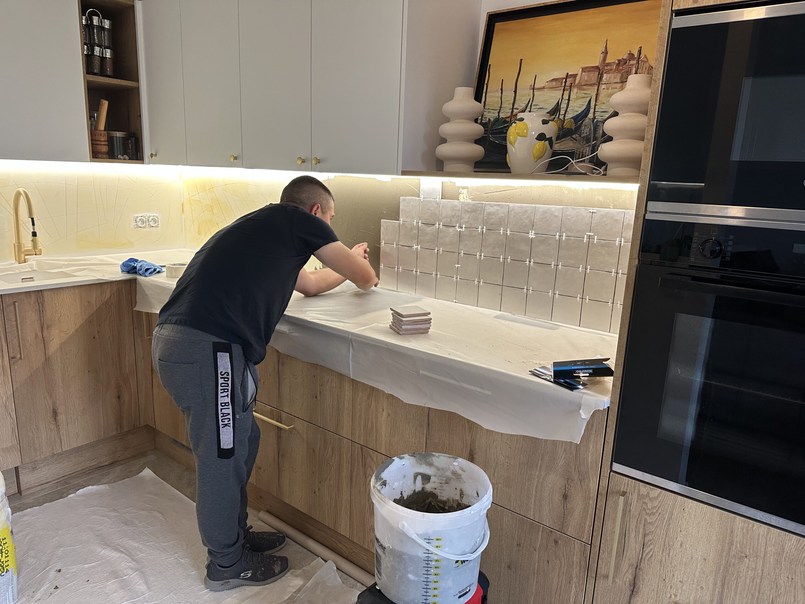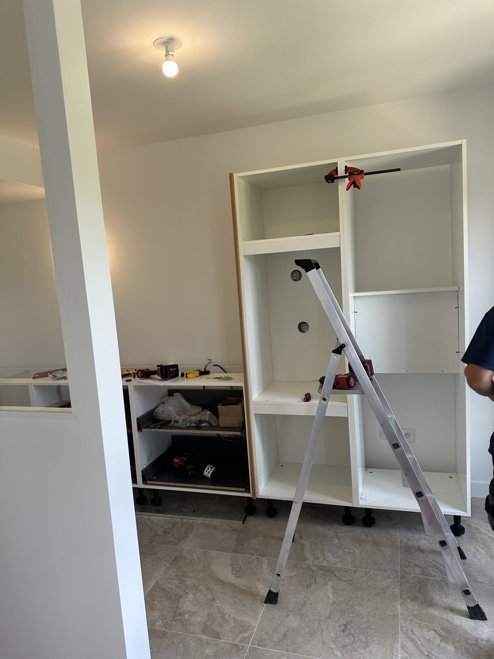 Installation complète d’une cuisine équipée, avec un plan de travail en quartz, une crédence en carrelage et l’intégration des appareils électroménagers.
