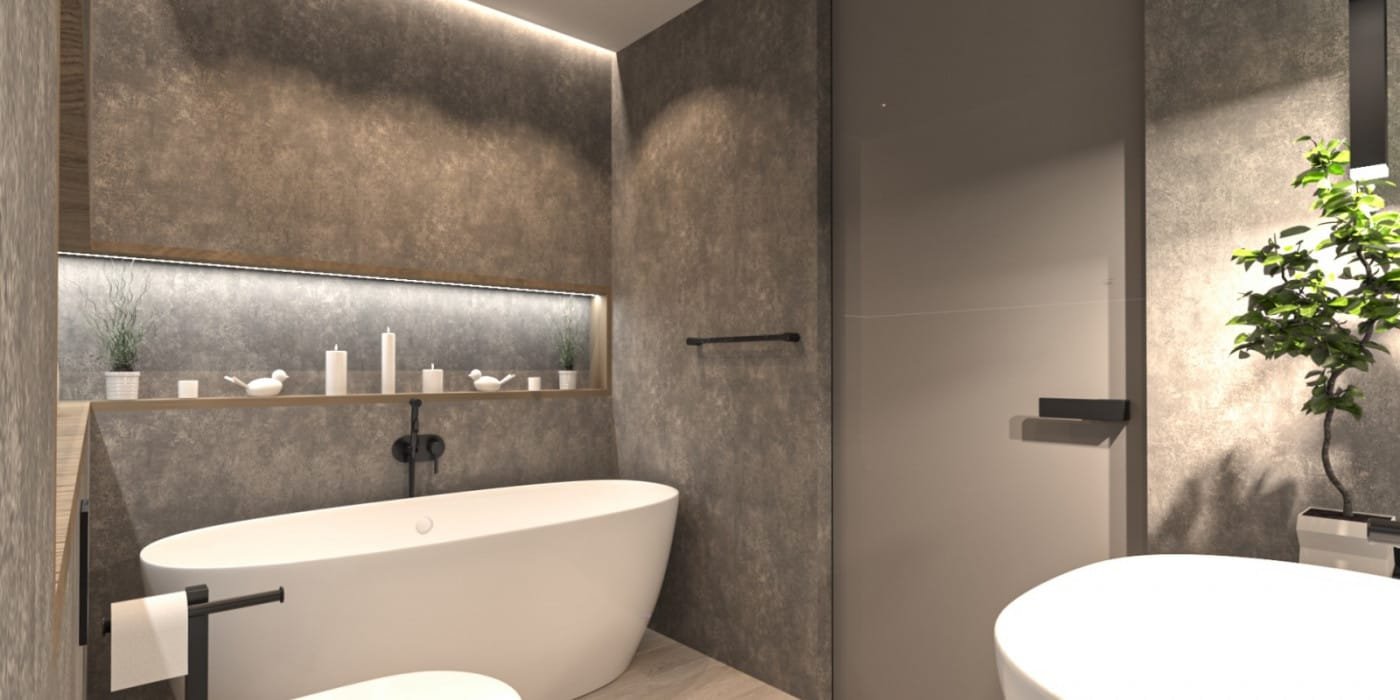 rénovation de salle de bain, pose de parquet, éclairage LED encastré, faux plafonds, peinture décorative, revêtements muraux texturés, et menuiserie intégrée.