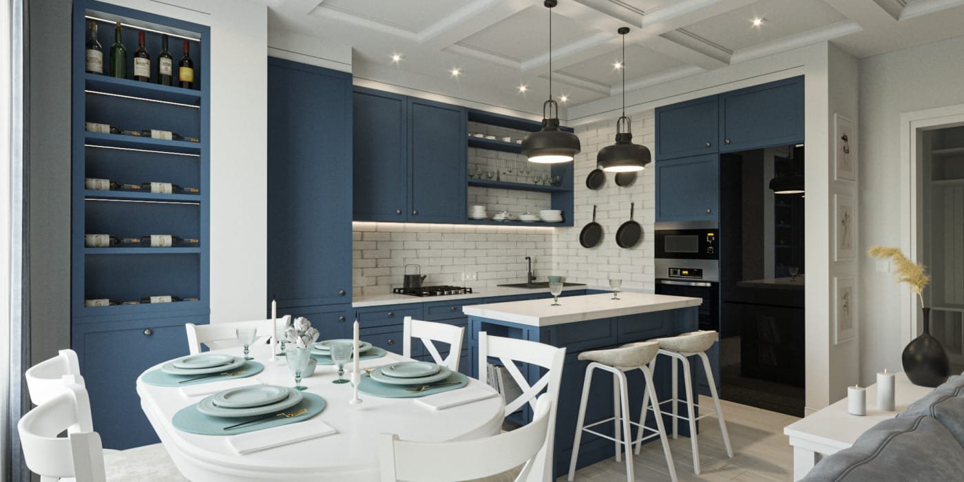 Le client a choisi une palette de couleurs modernes (blanc cassé, gris clair, bleu nuit) et des matériaux robustes : meubles en finition satinée, plans de travail compacts, luminaires intégrés.