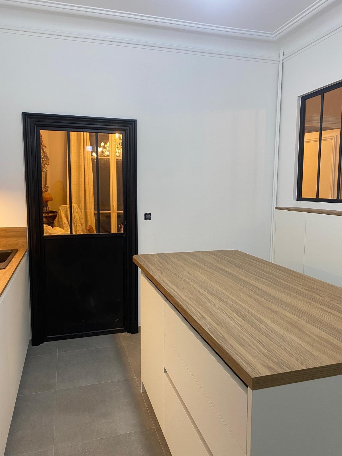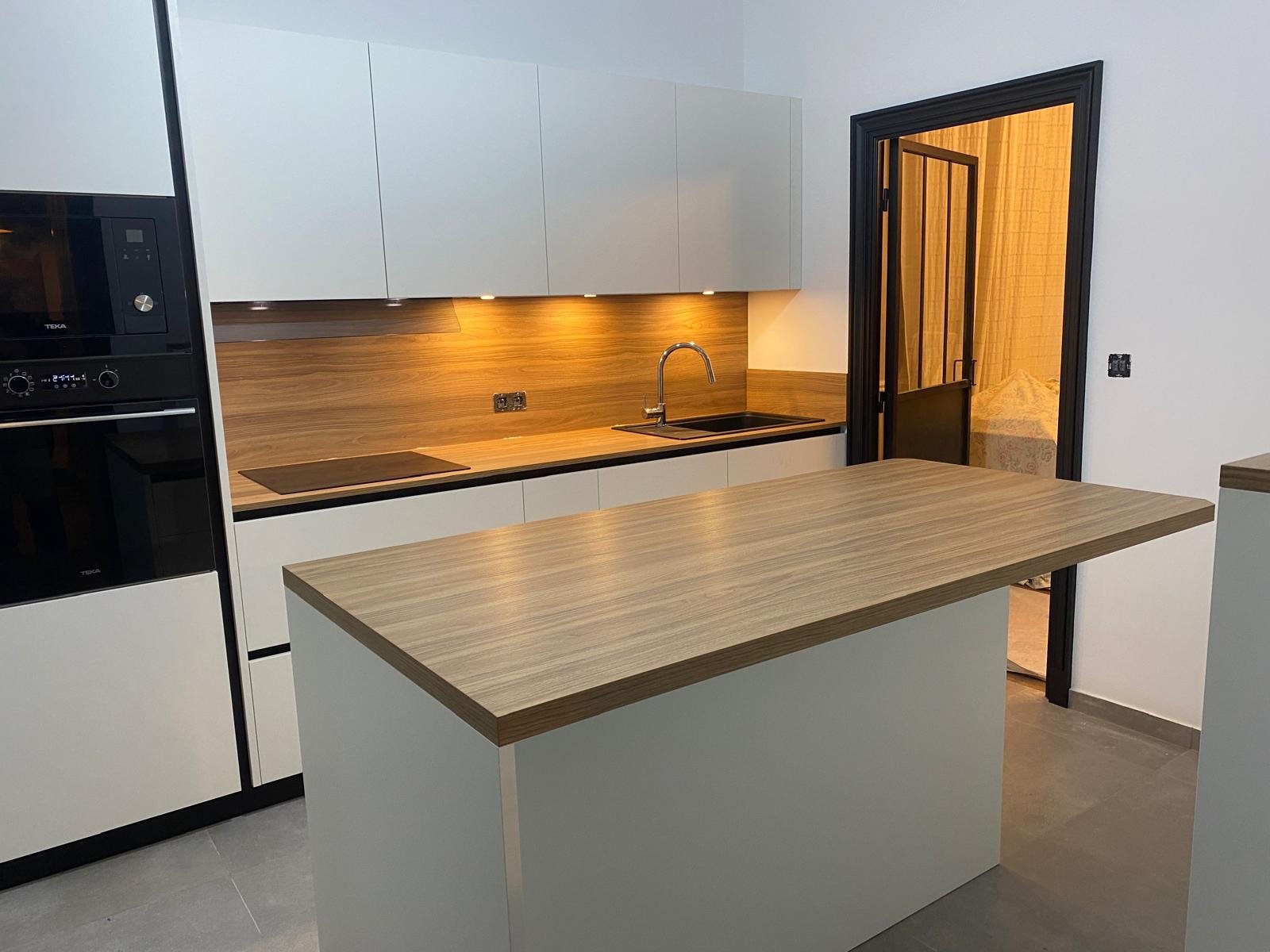 La cuisine a été entièrement conçue sur mesure, avec un mobilier laqué blanc mat sans poignées apparentes, contrasté par une crédence et un plan de travail en décor bois naturel. Le grand îlot central offre à la fois une surface de préparation et un espace repas convivial.