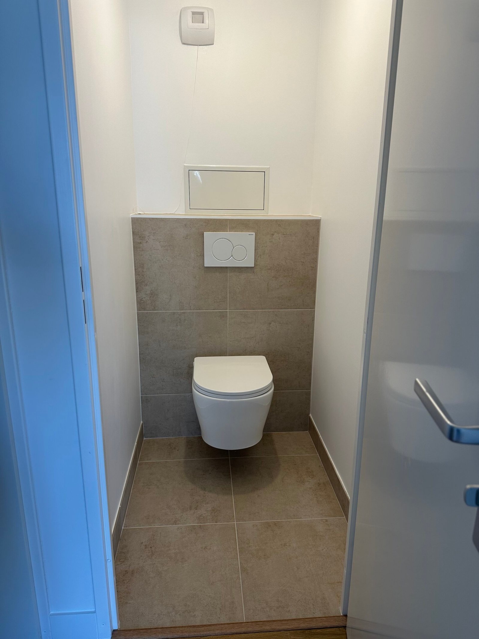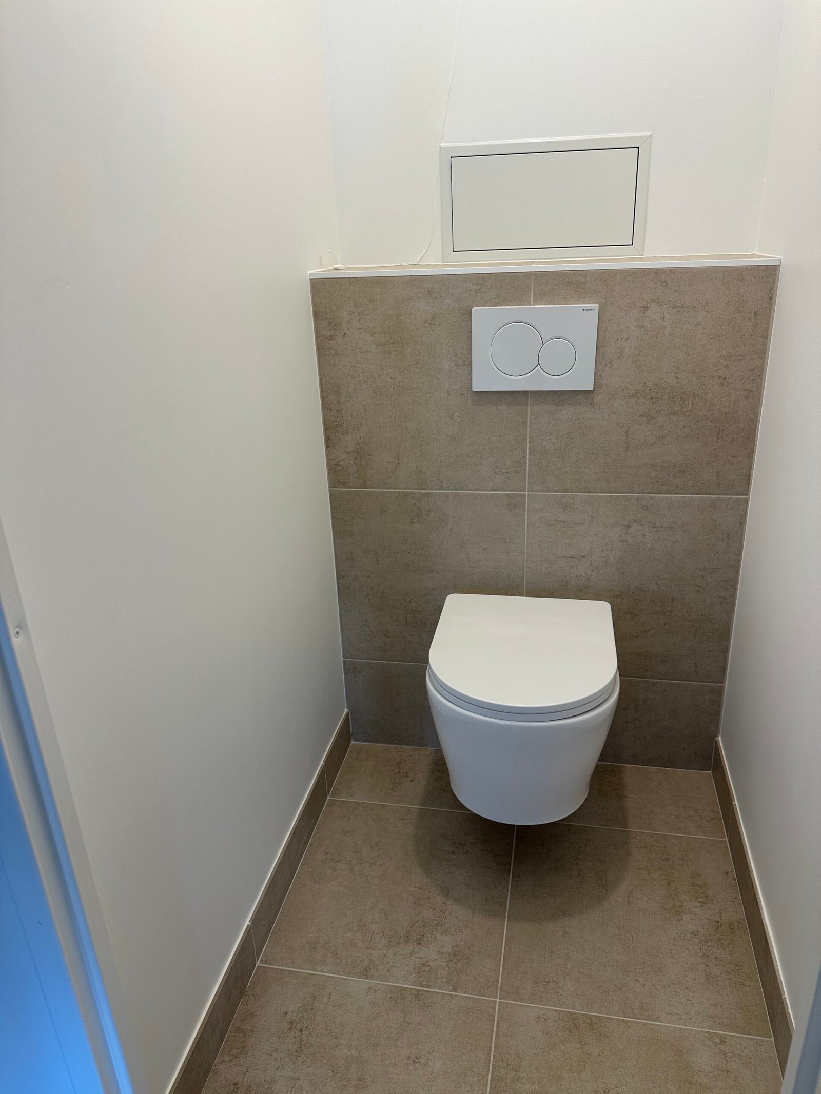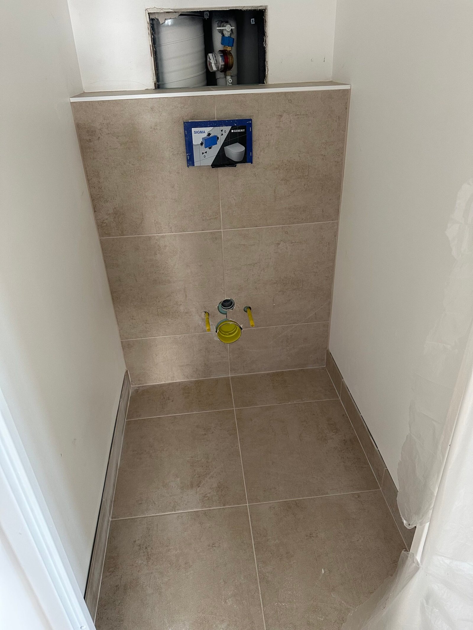 Dans la toilette, installation d’un WC suspendu avec carrelage mural et au sol.