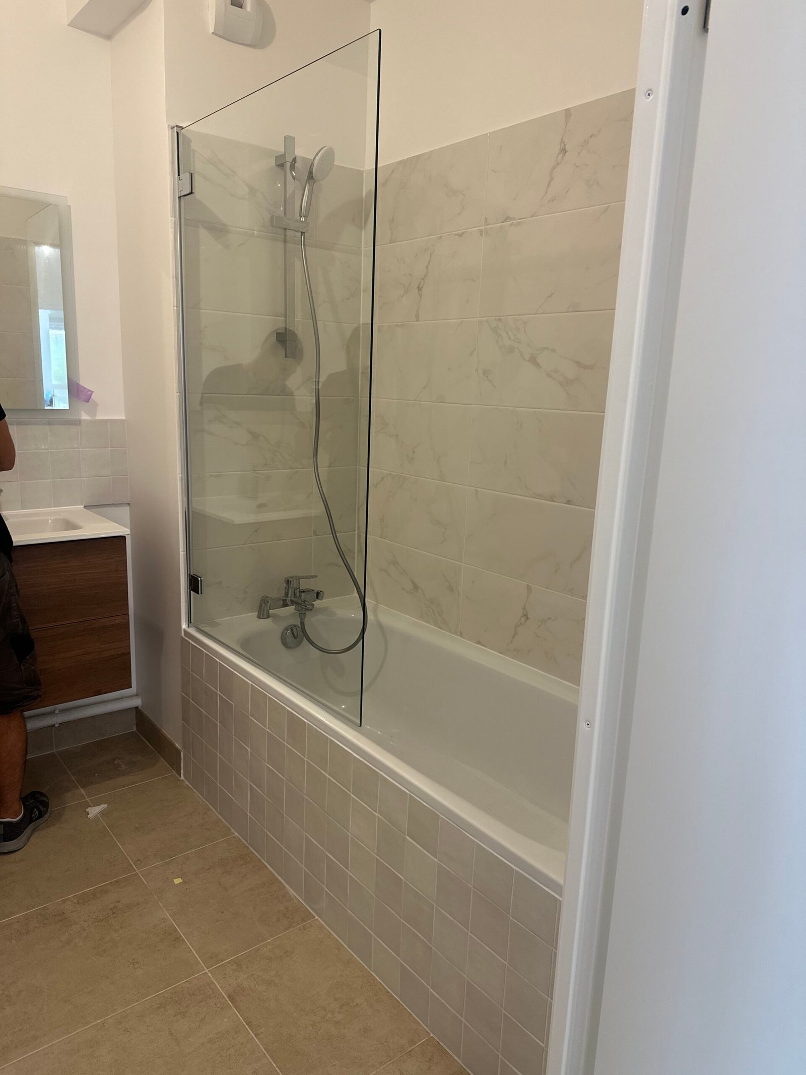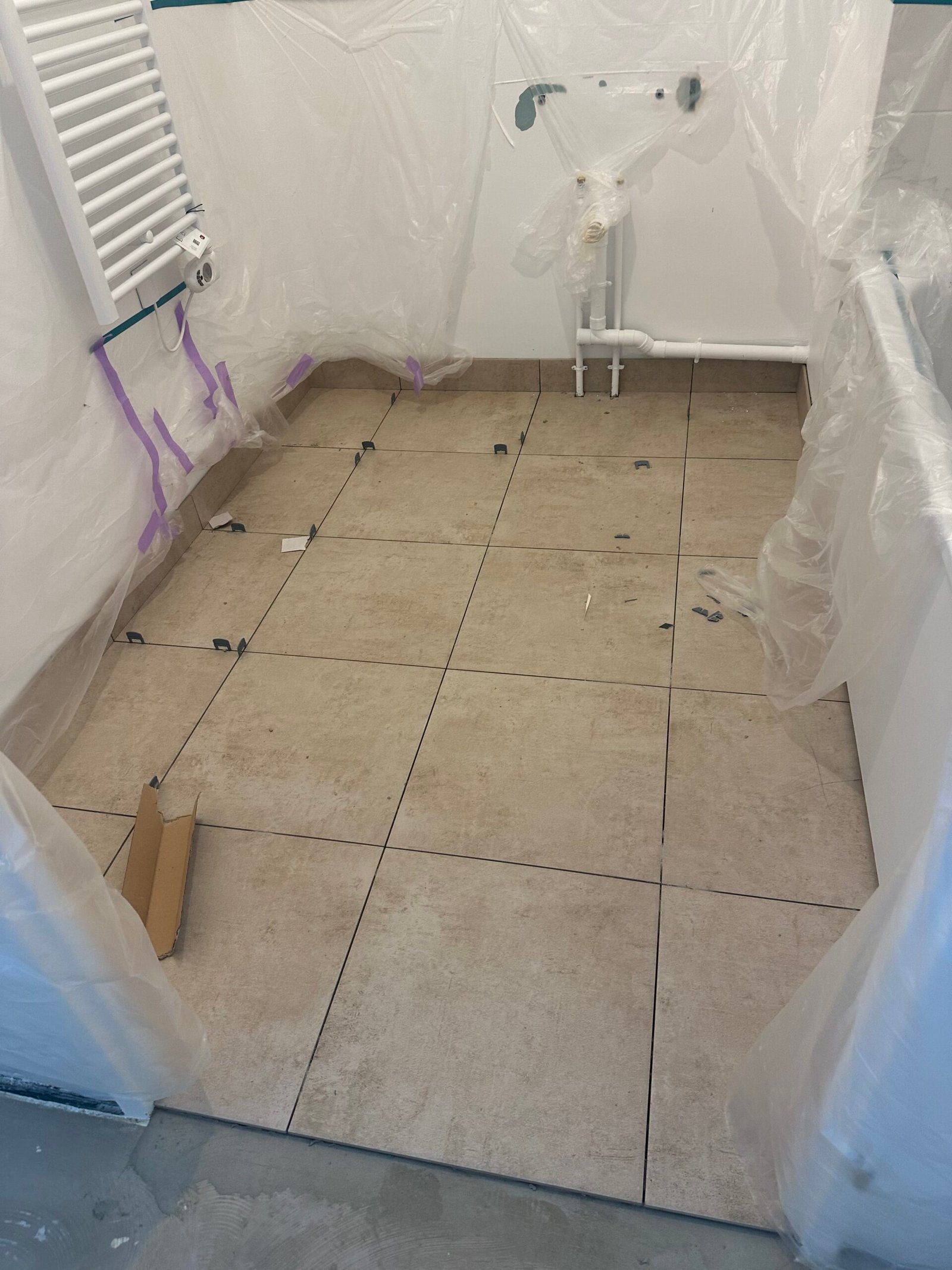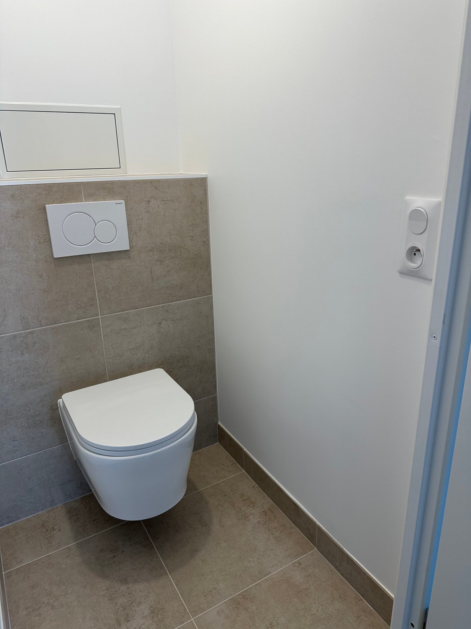 Dans la toilette, installation d’un WC suspendu avec carrelage mural et au sol.