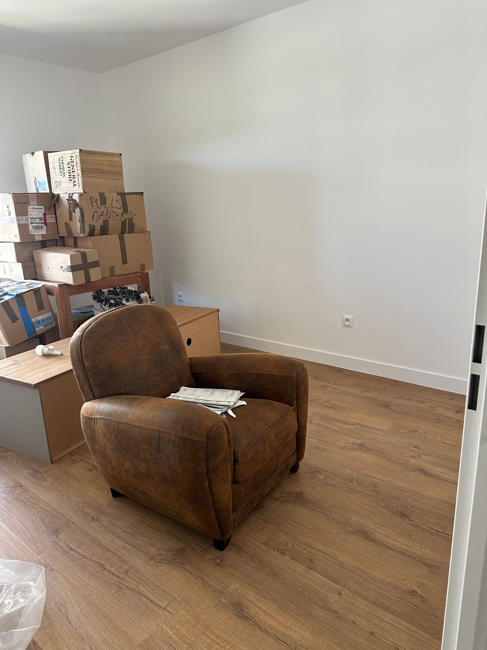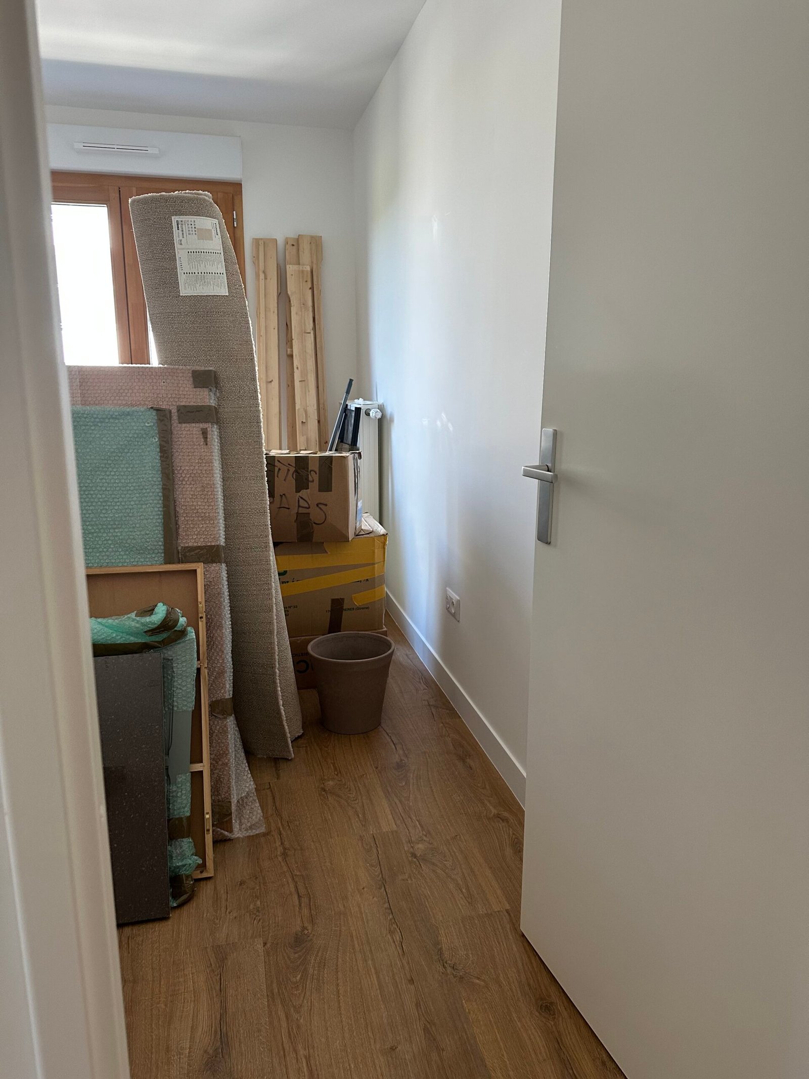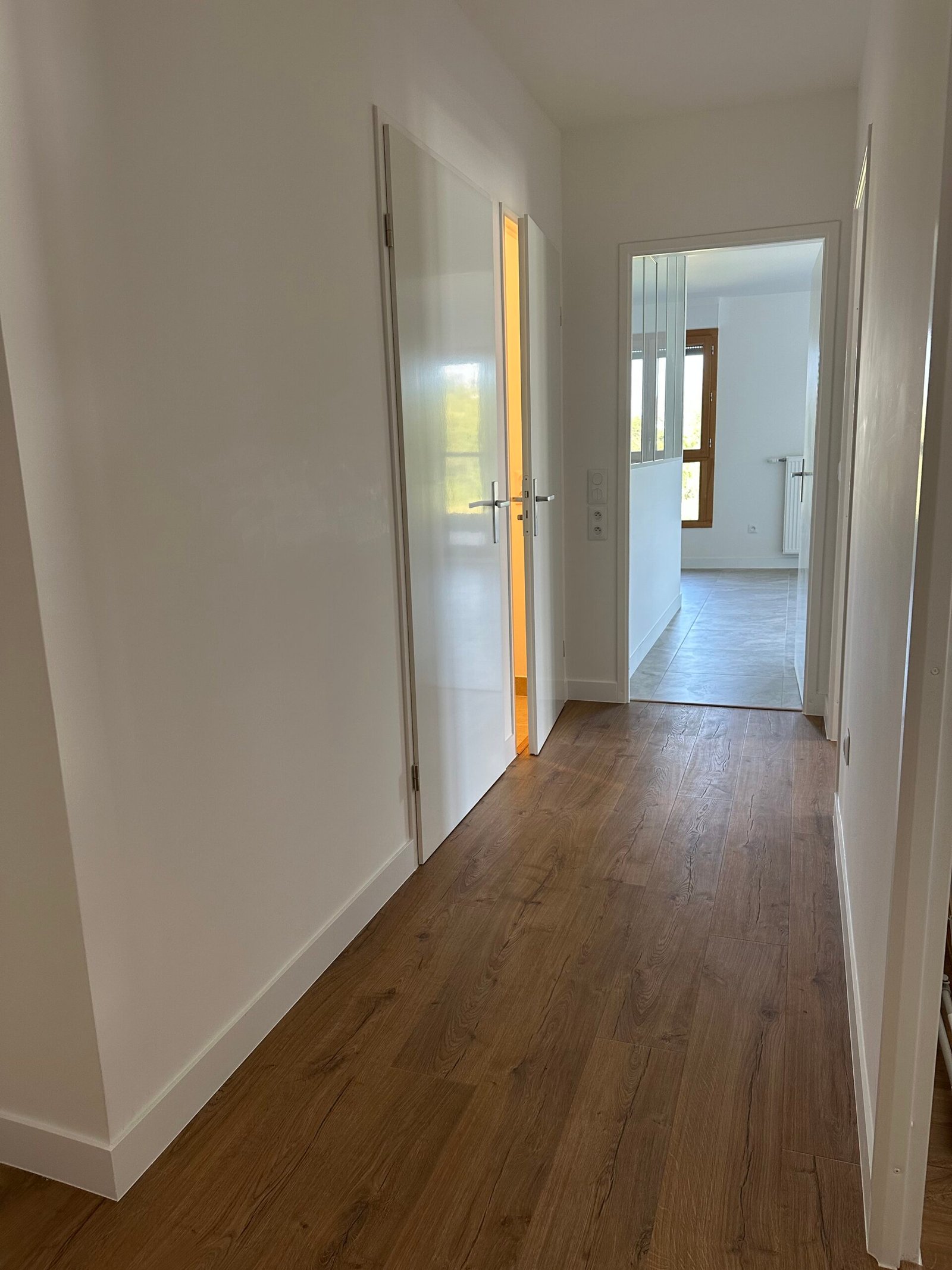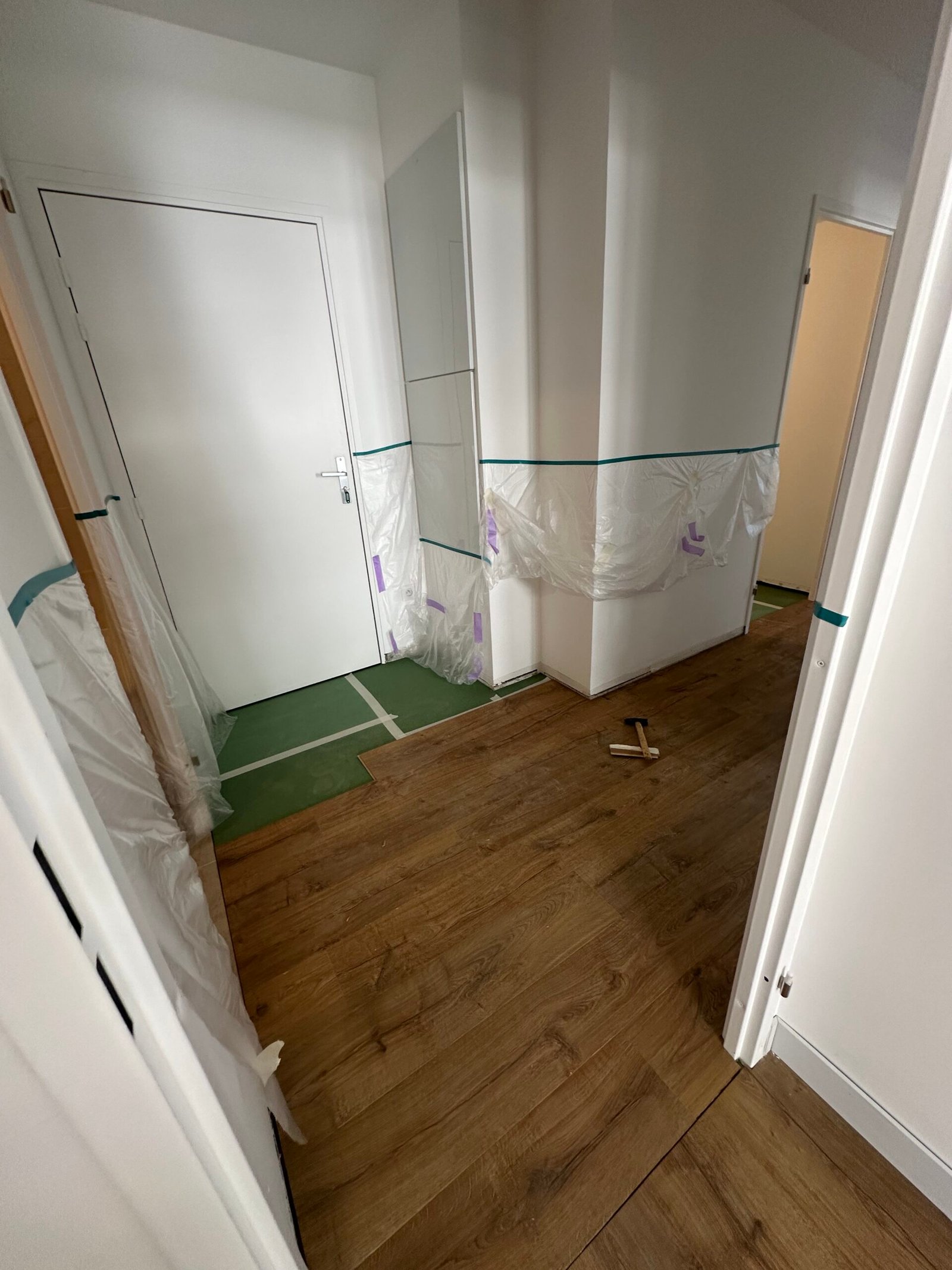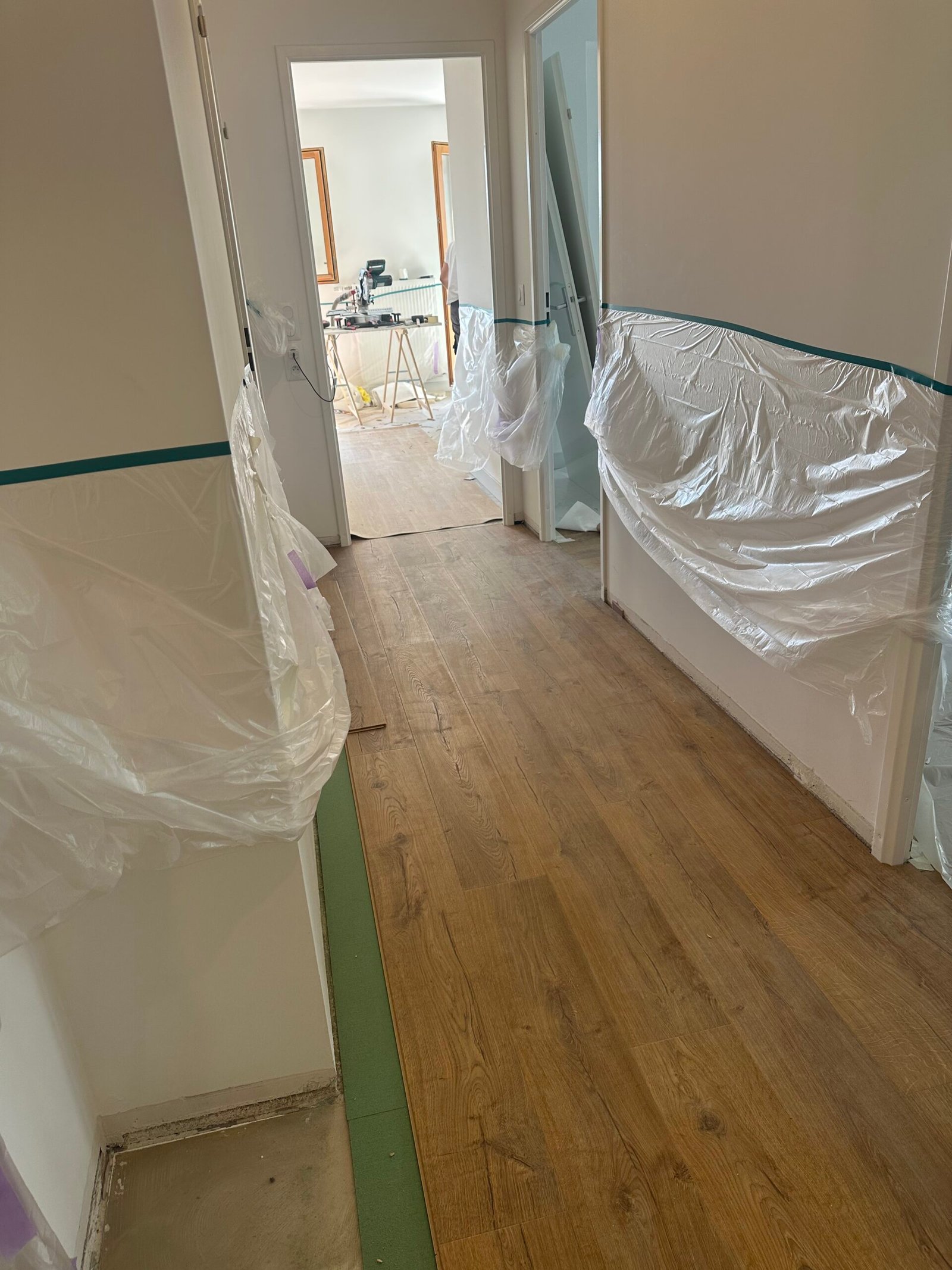 Pose d’un parquet dans les quatre chambres, le couloir et le séjour, offrant une finition chaleureuse et moderne.