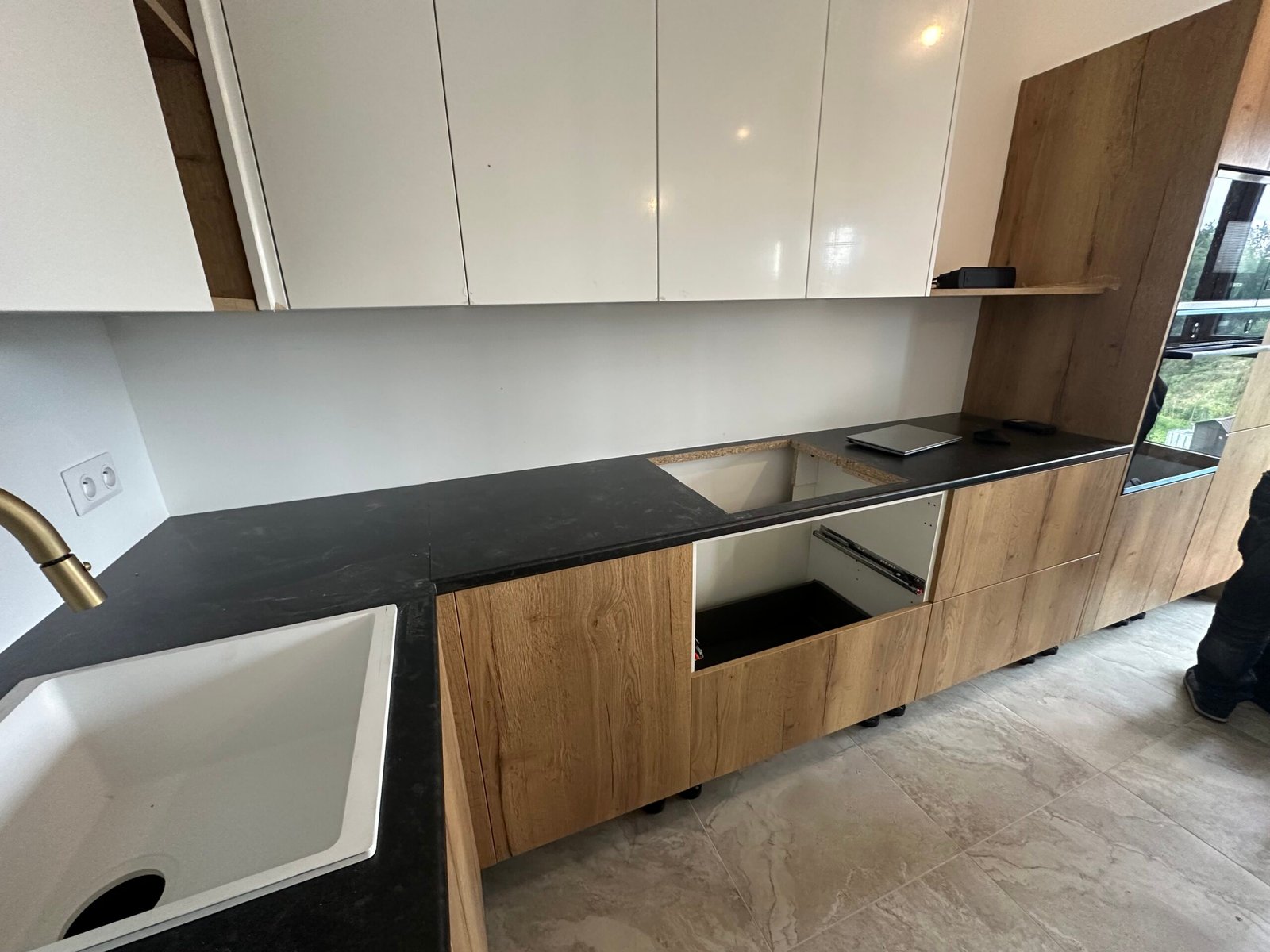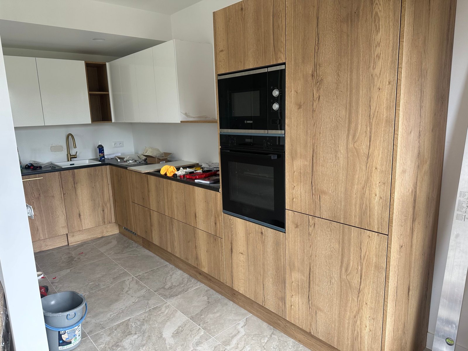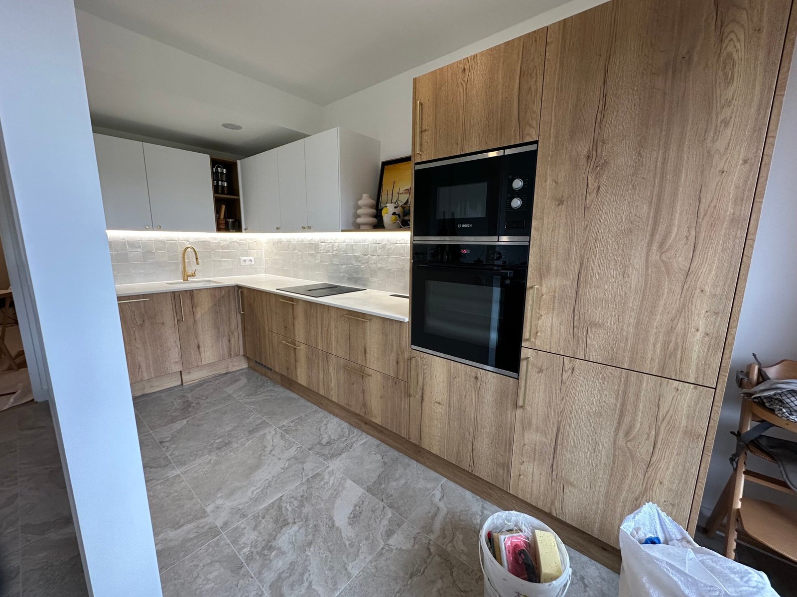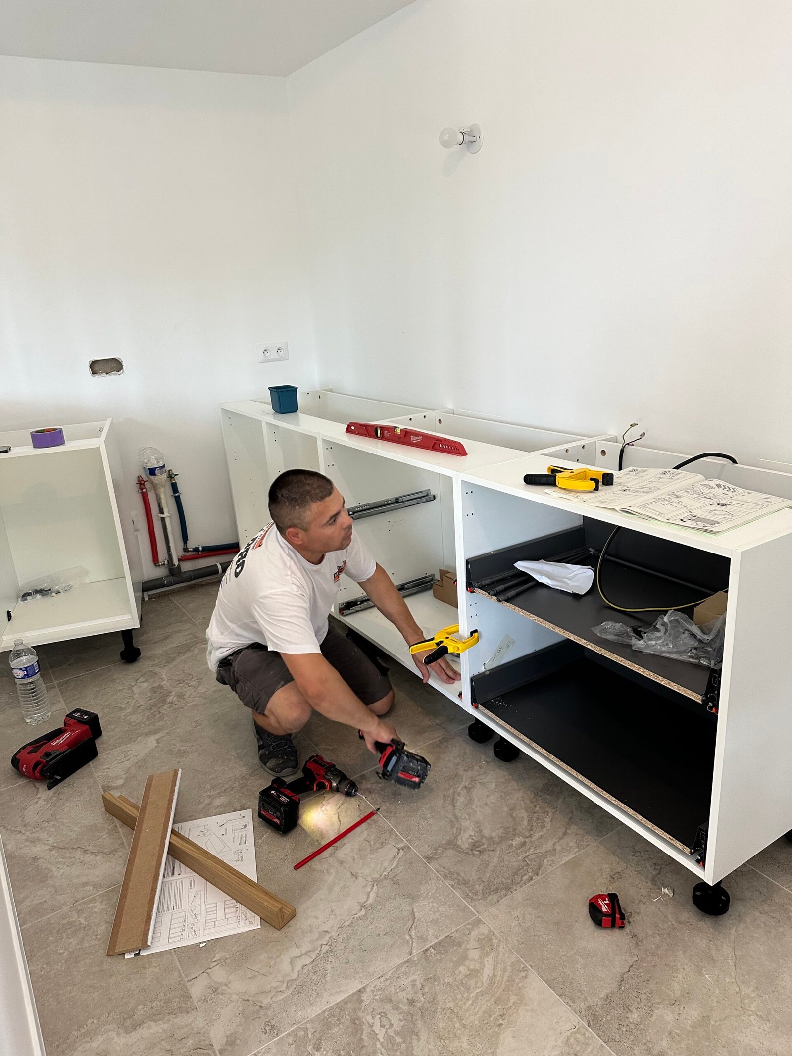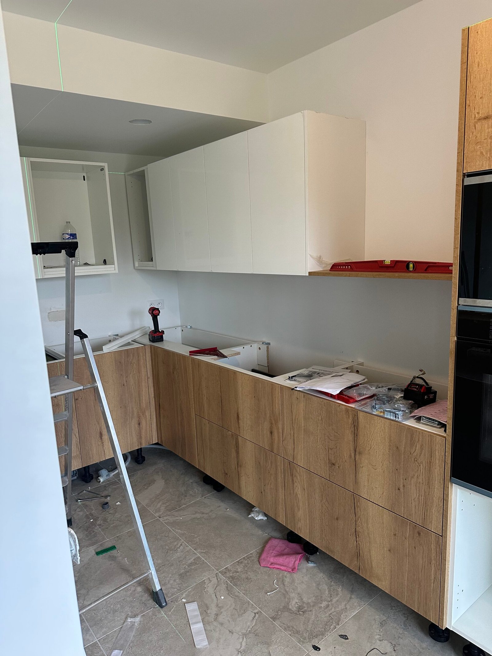 Installation complète d’une cuisine équipée, avec un plan de travail en quartz, une crédence en carrelage et l’intégration des appareils électroménagers.