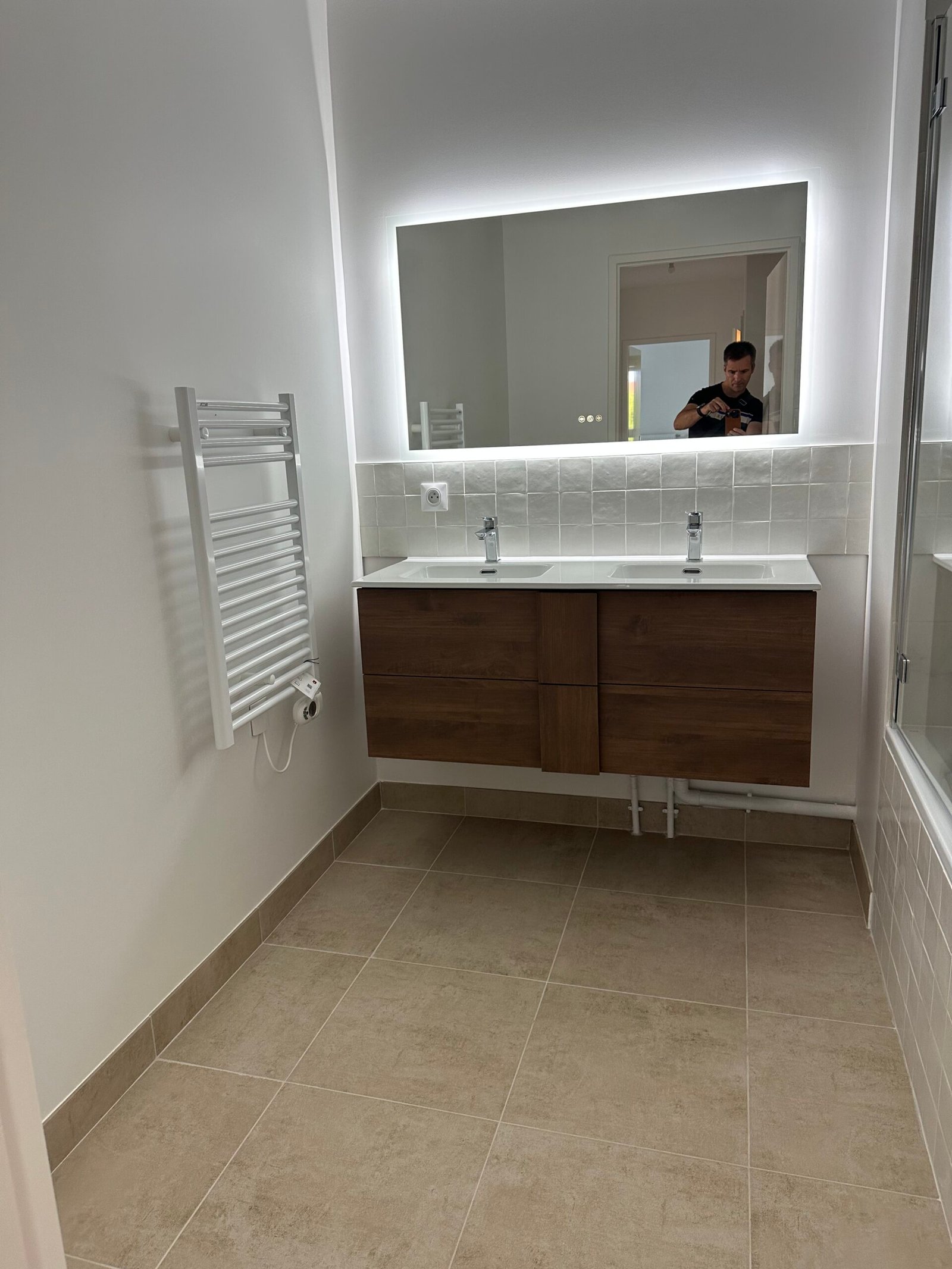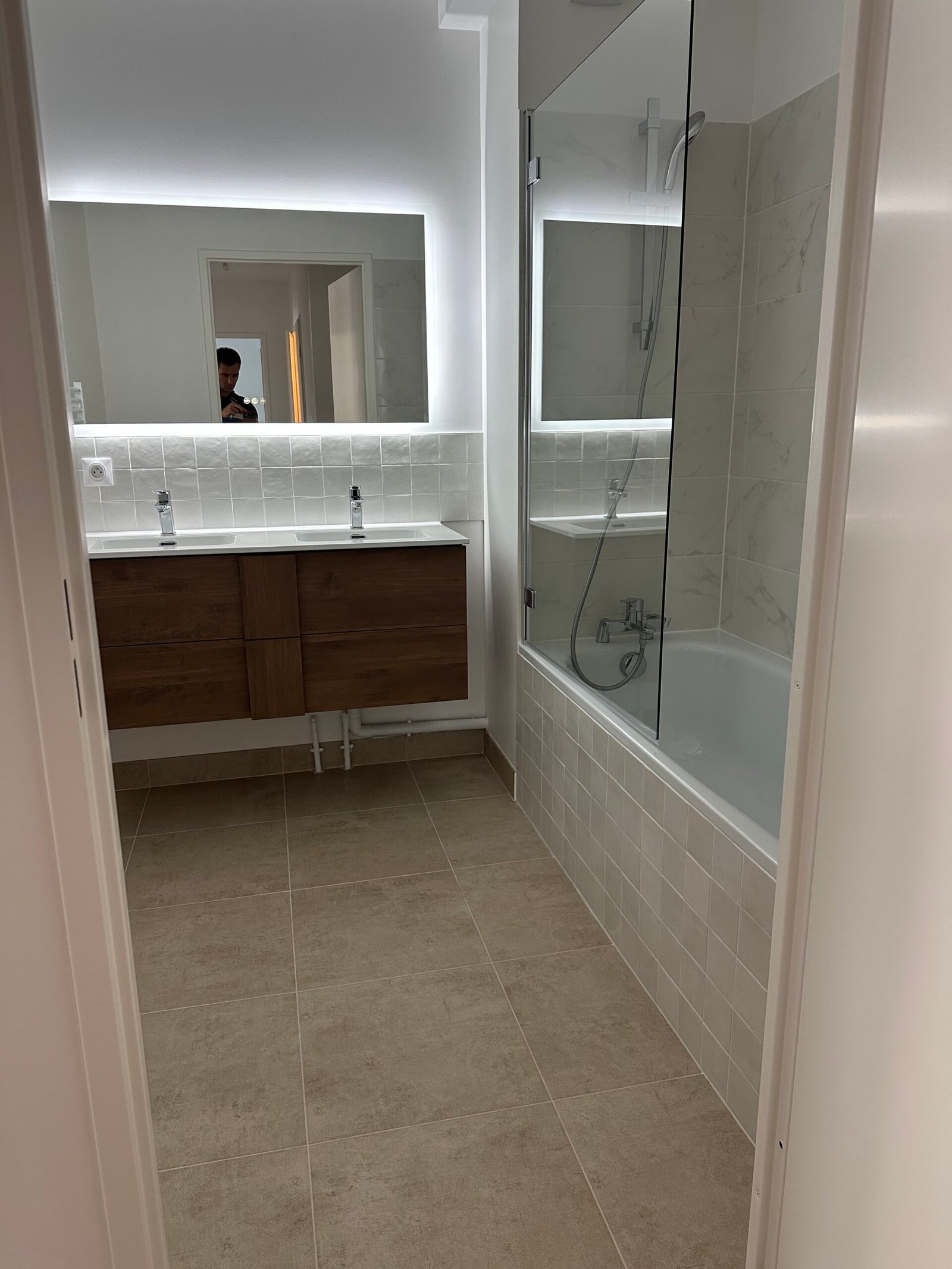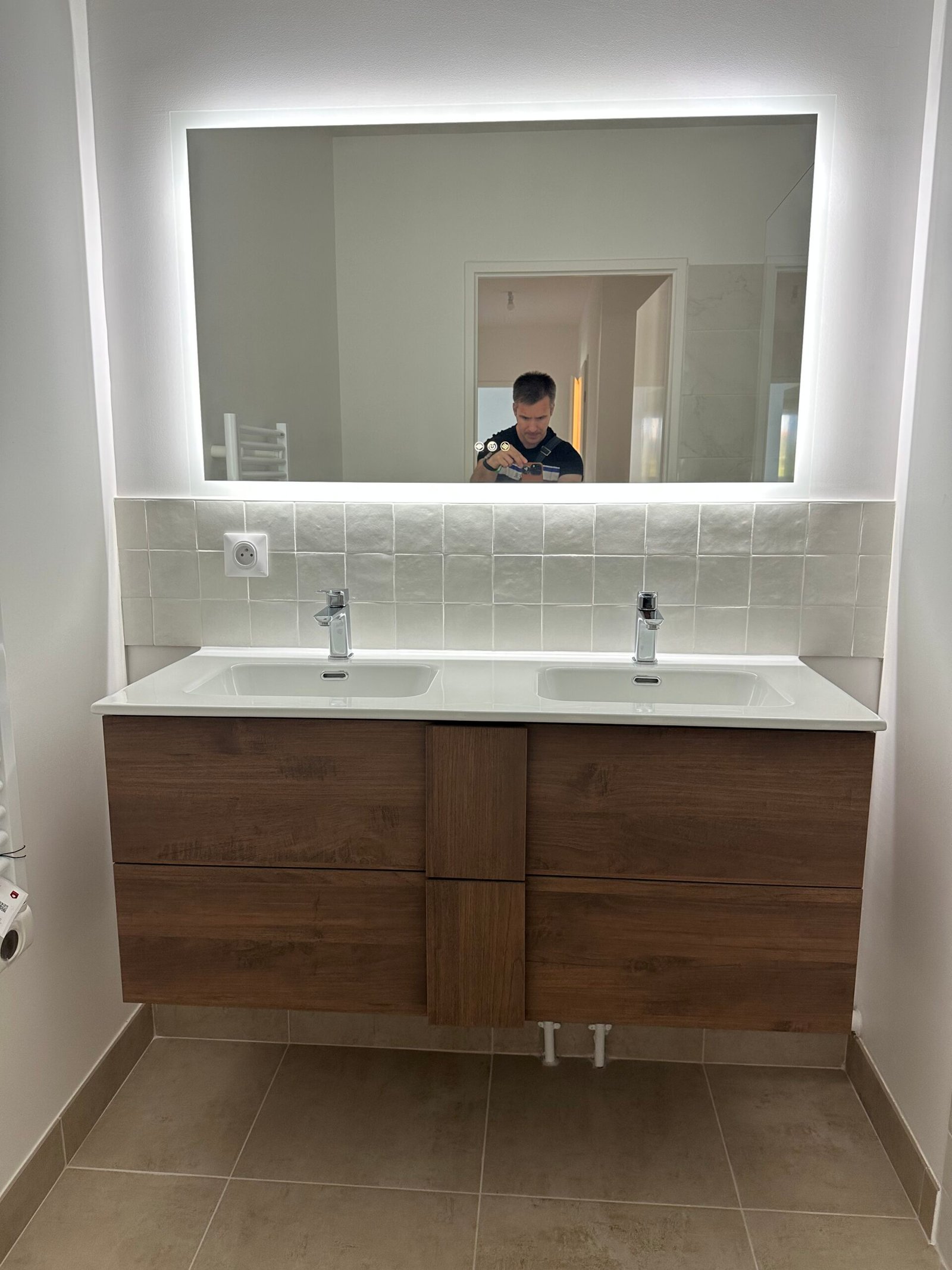 Dans la salle de bain, pose d’un double vasque, d’un carrelage mural décoratif et d’un sol assorti pour un rendu élégant et harmonieux.