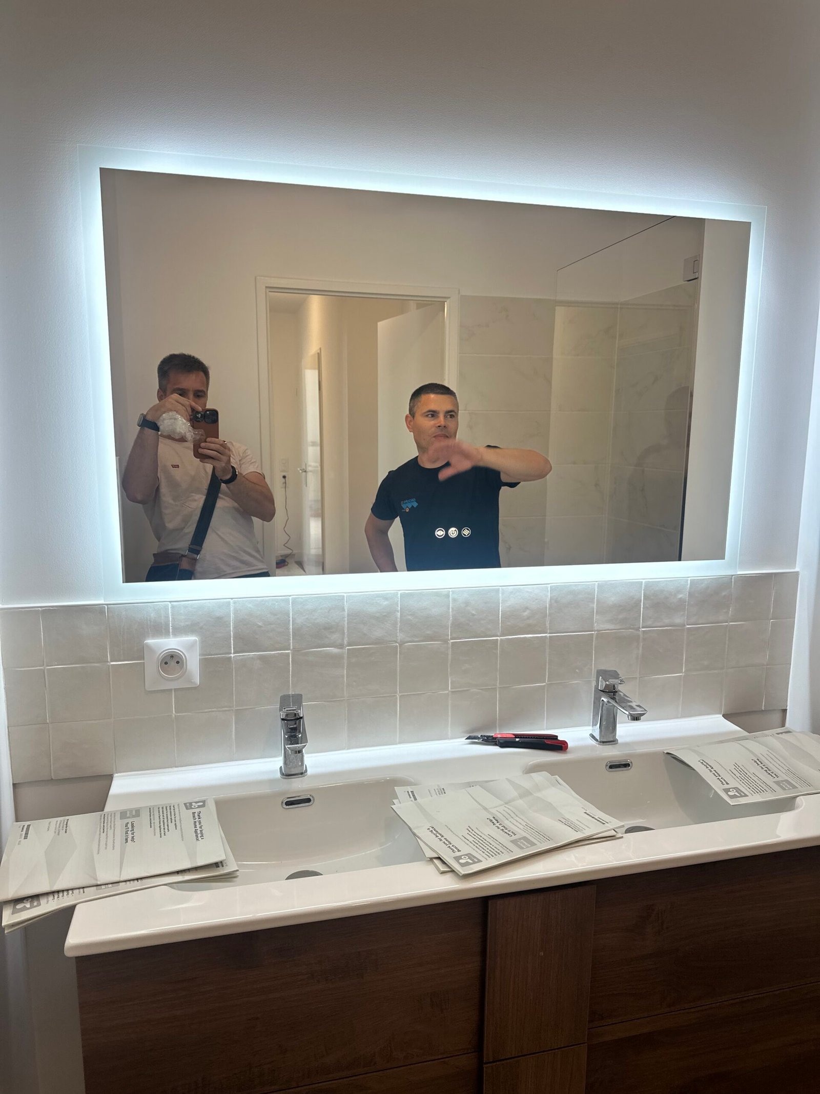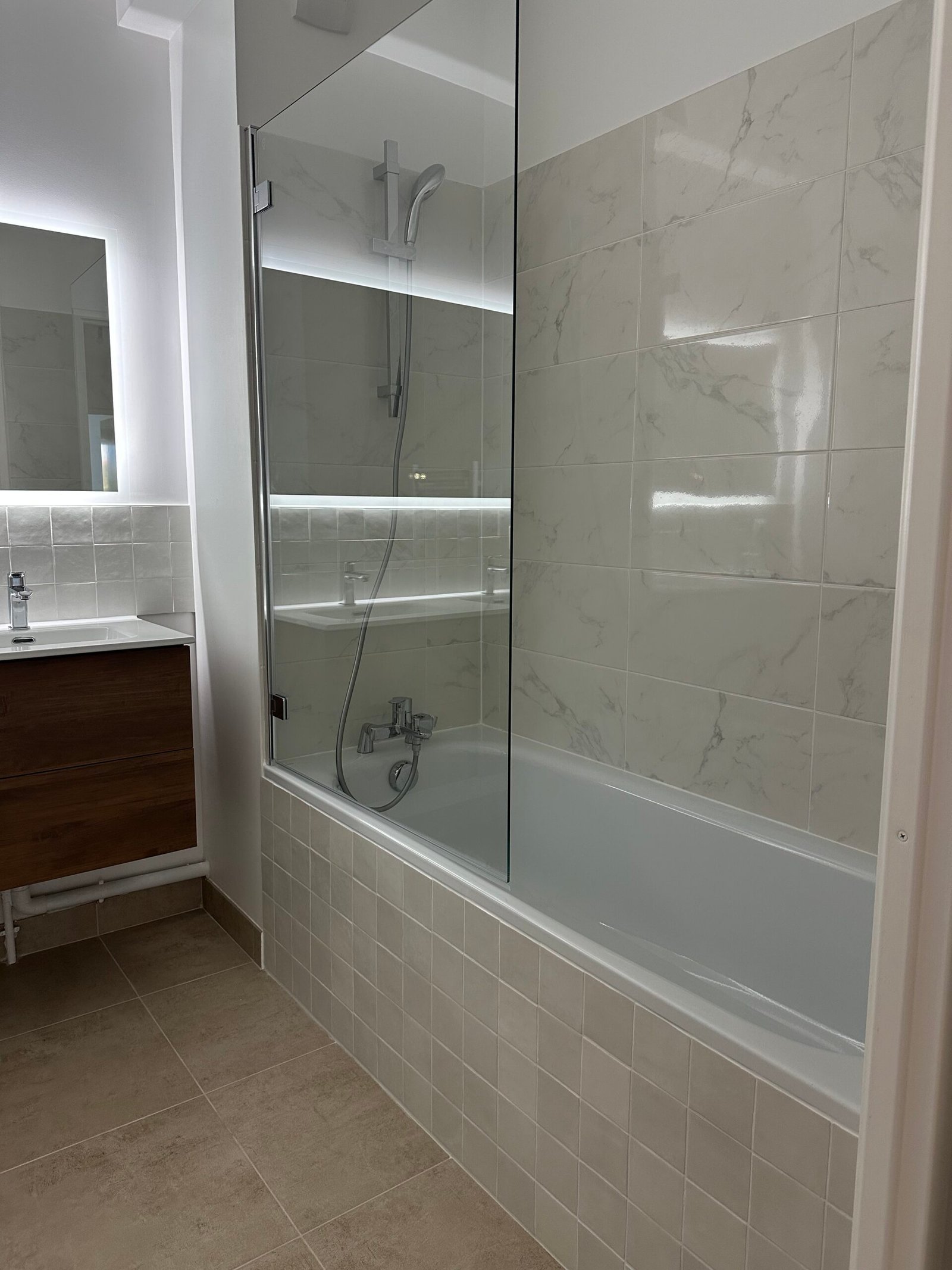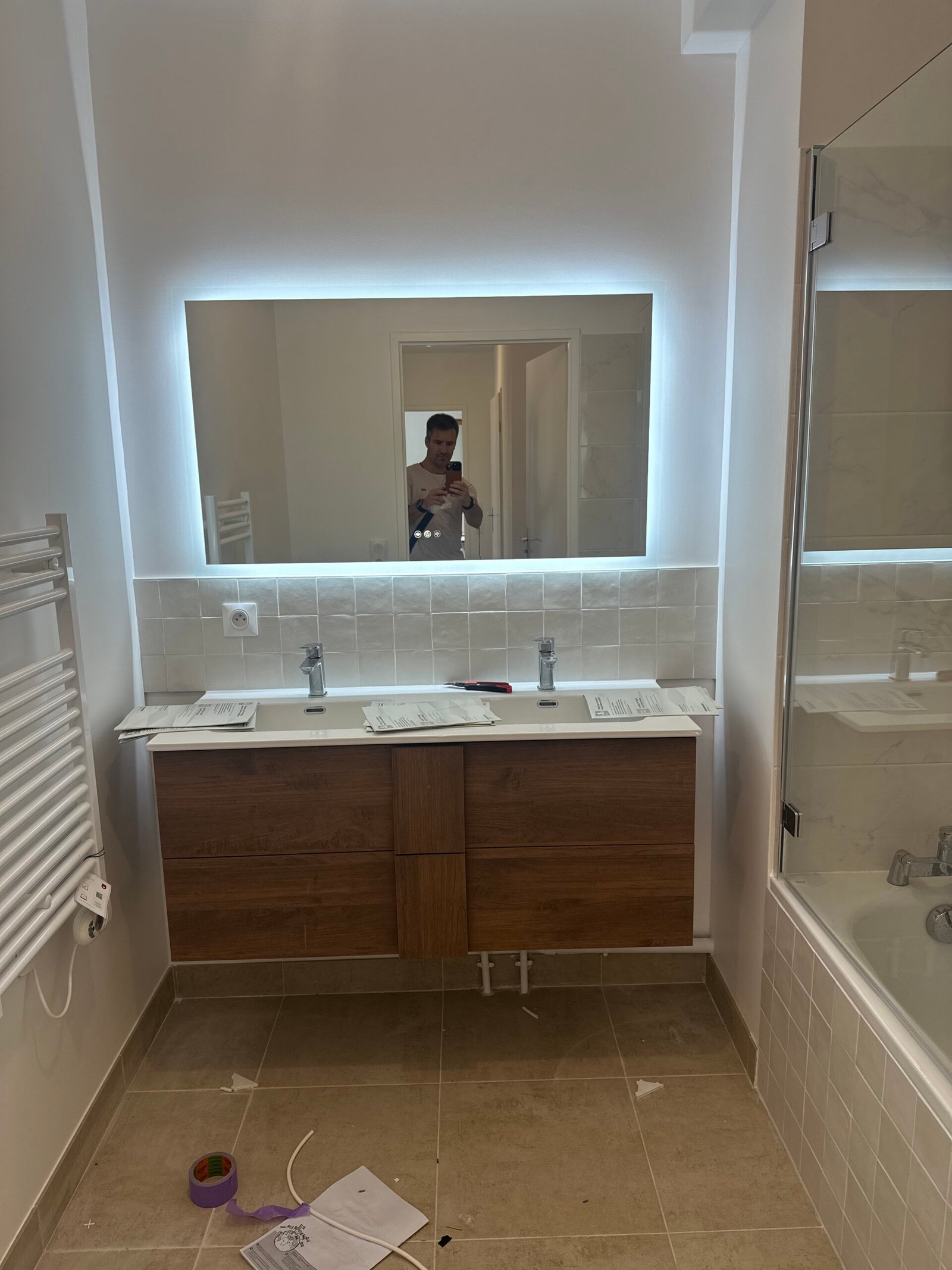 Dans la salle de bain, pose d’un double vasque, d’un carrelage mural décoratif et d’un sol assorti pour un rendu élégant et harmonieux.