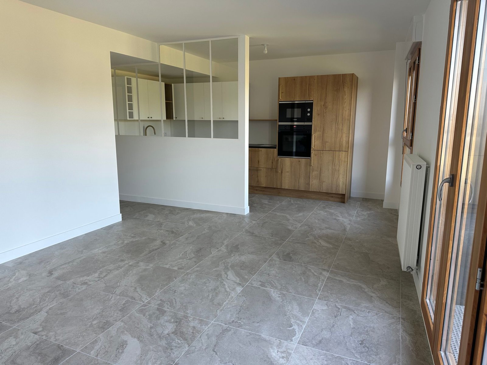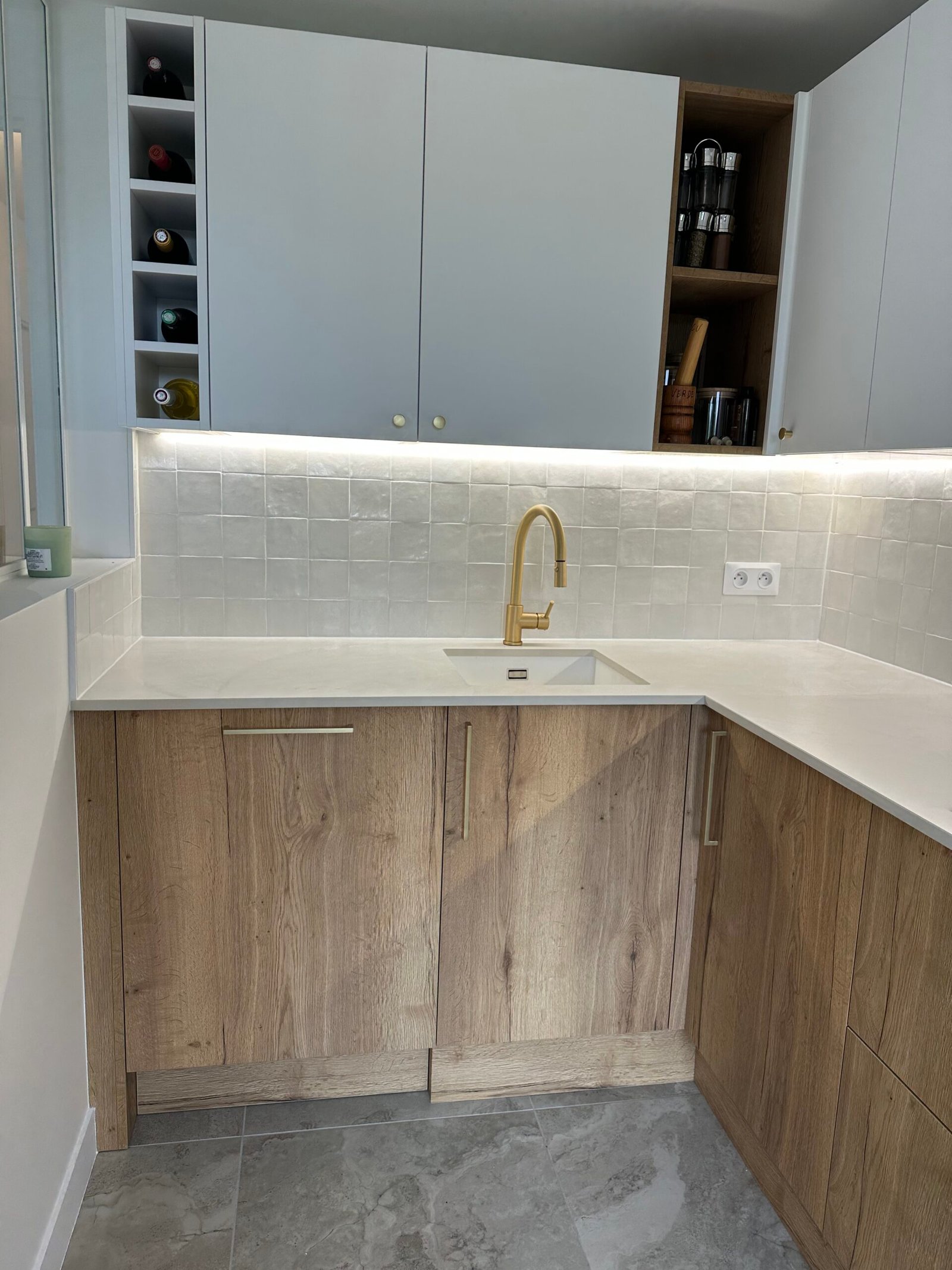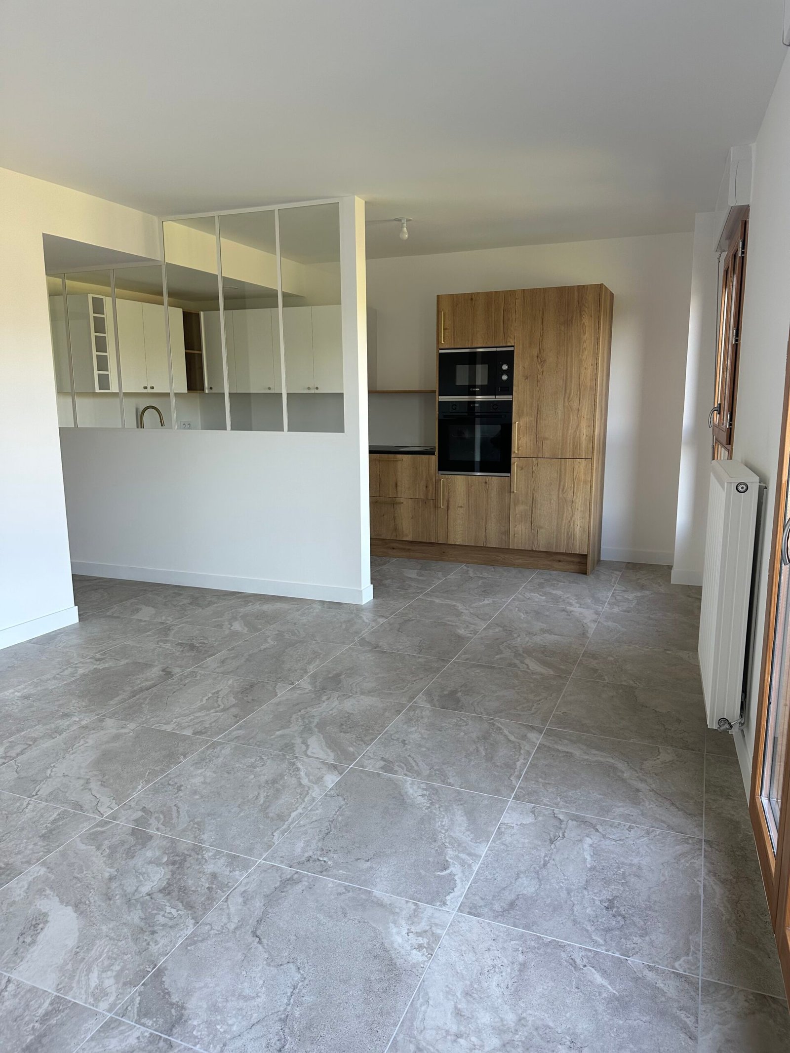 Dans la cuisine et les pièces humides, un carrelage grand format a été posé pour plus de résistance et de facilité d’entretien.
