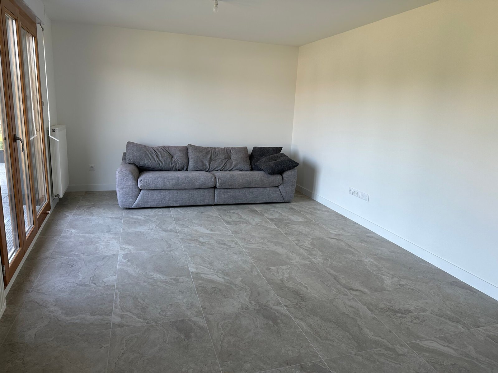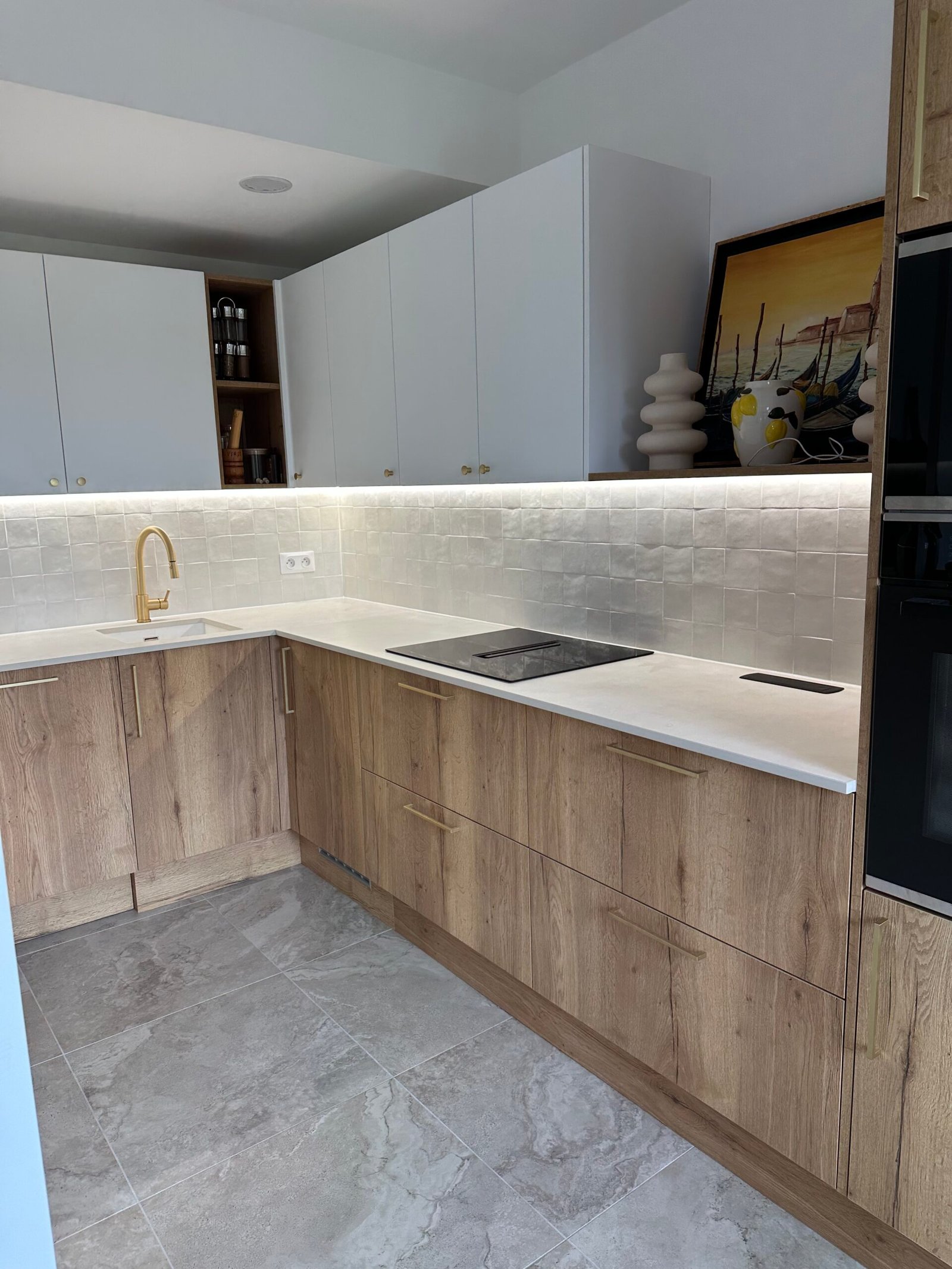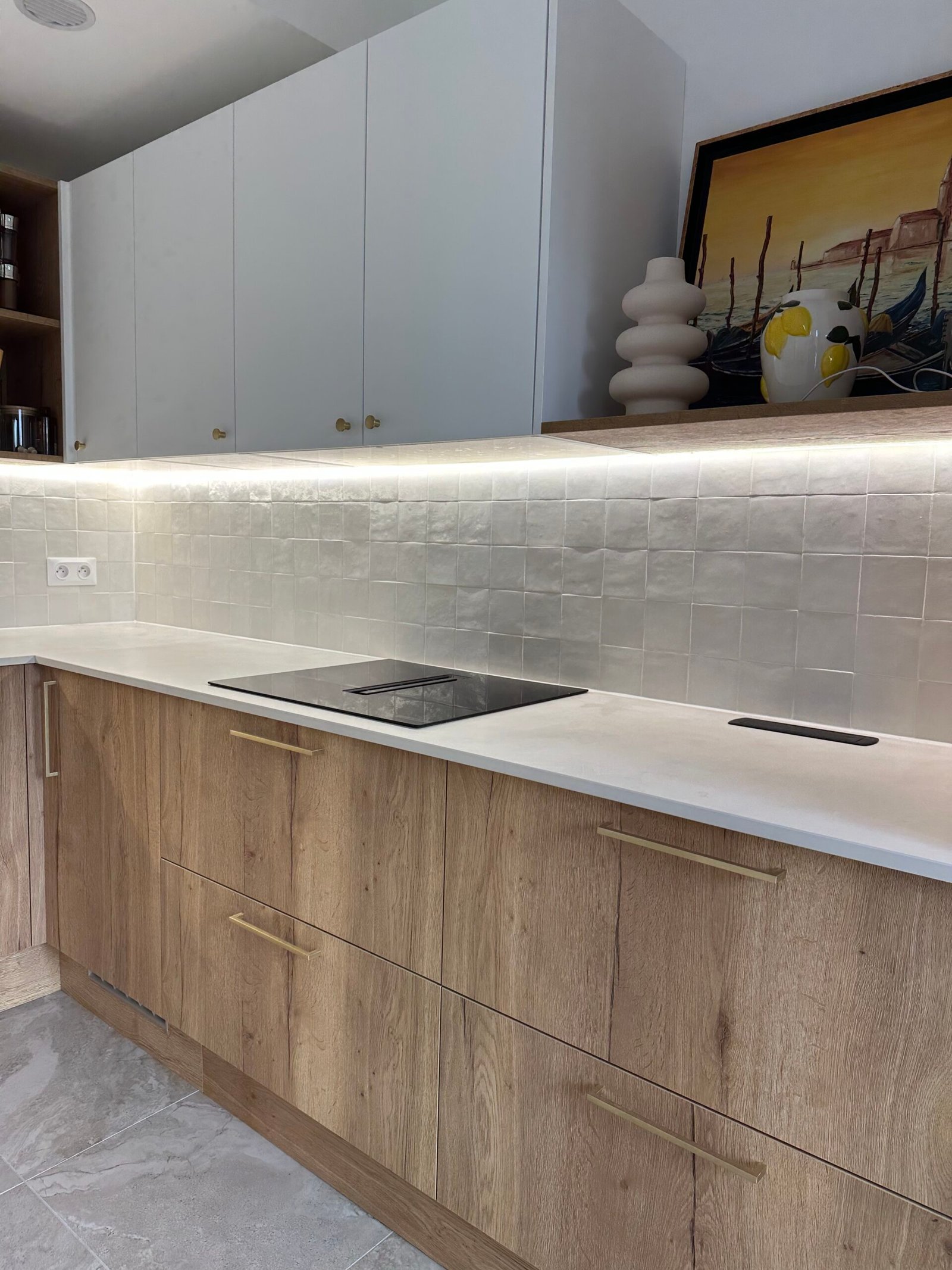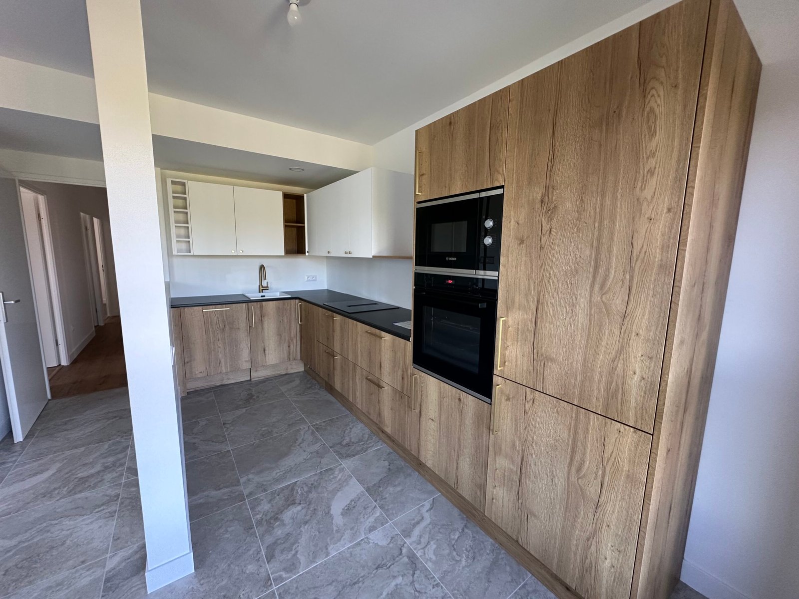 Dans la cuisine et les pièces humides, un carrelage grand format a été posé pour plus de résistance et de facilité d’entretien.