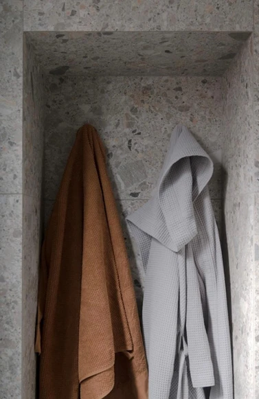 Cette salle de bain incarne une esthétique contemporaine chaleureuse, avec une prédominance du terrazzo gris moucheté, associé au bois naturel et à une lumière douce.