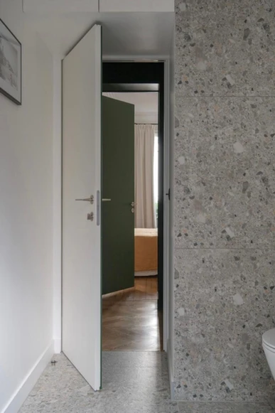 MHN Construction a réalisé la transformation complète d’une salle de bain à Paris, en créant un espace à la fois élégant, fonctionnel et au style unique, grâce à l’utilisation du carrelage terrazzo pleine hauteur et d’un mobilier soigneusement conçu.