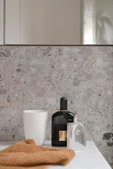 Pose de carrelage terrazzo effet pierre naturelle, du sol jusqu’au plafond